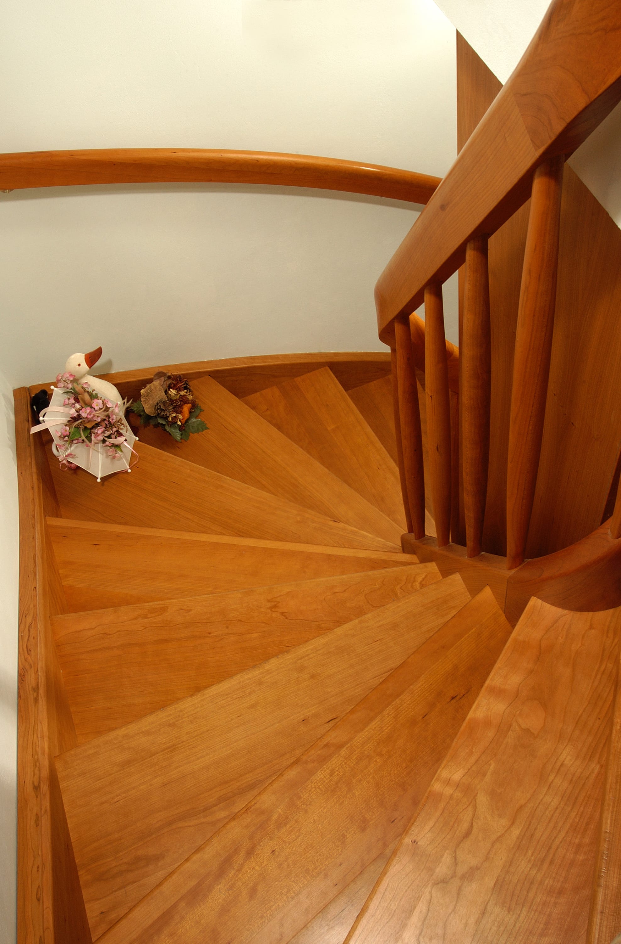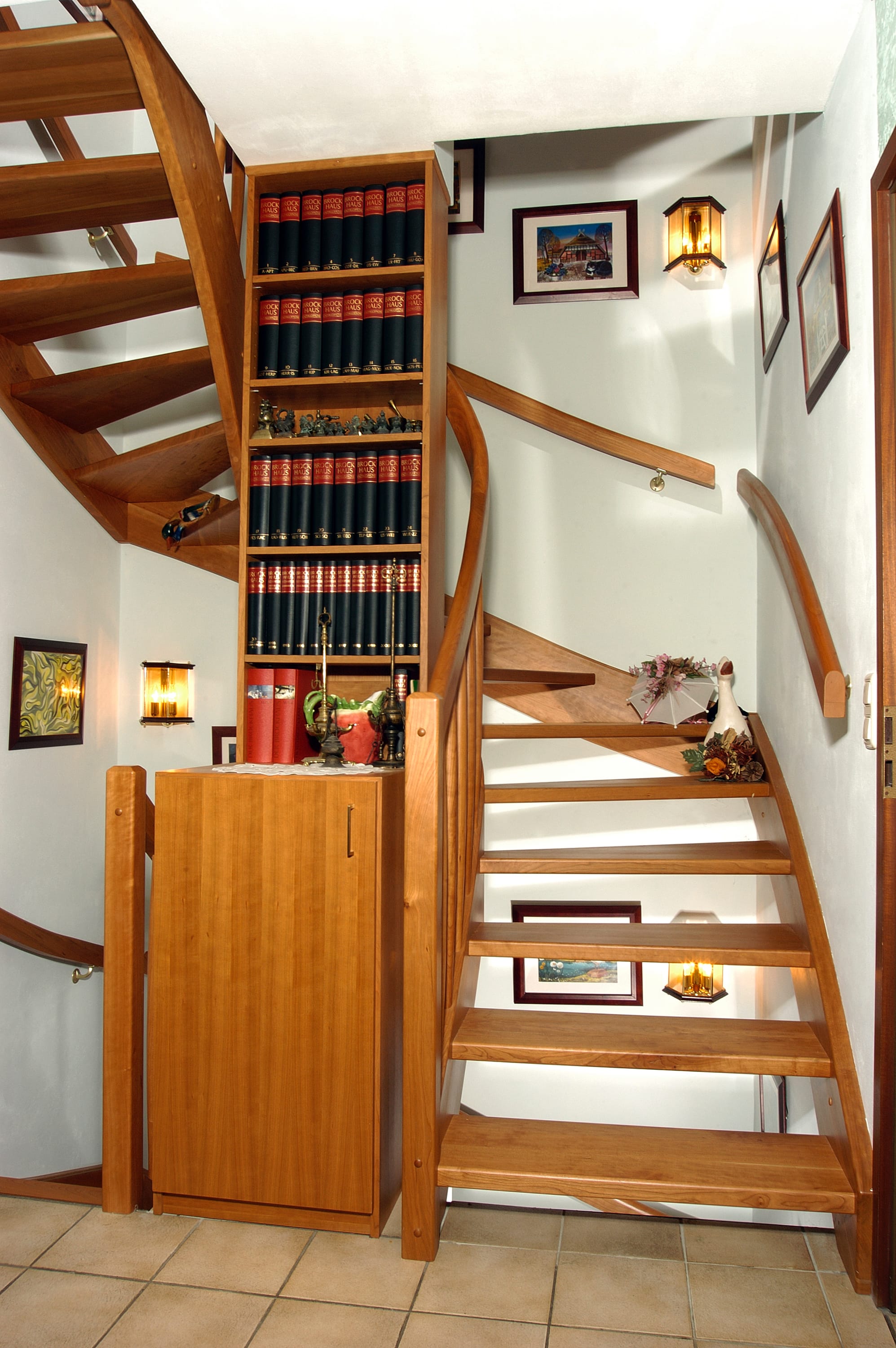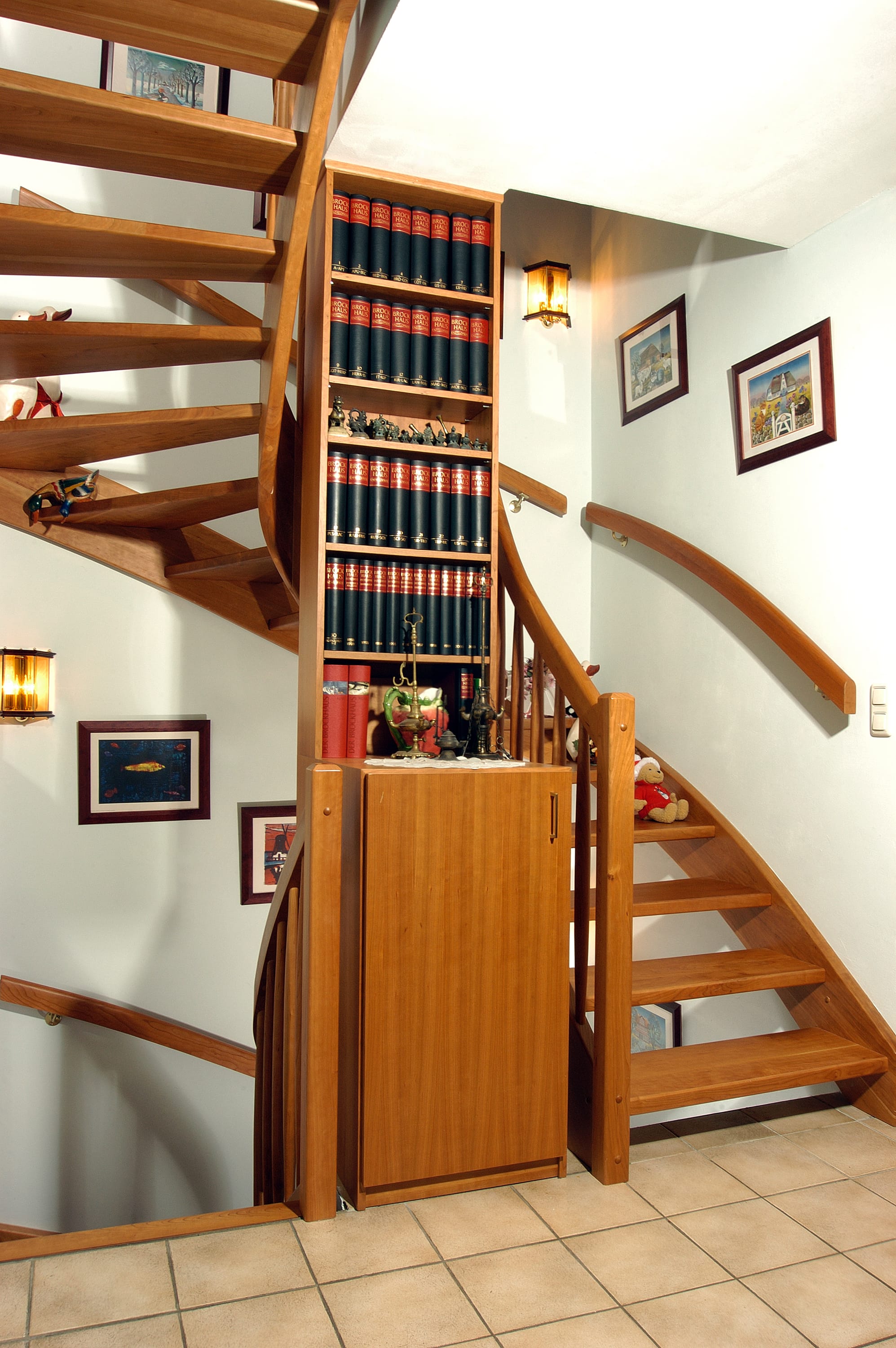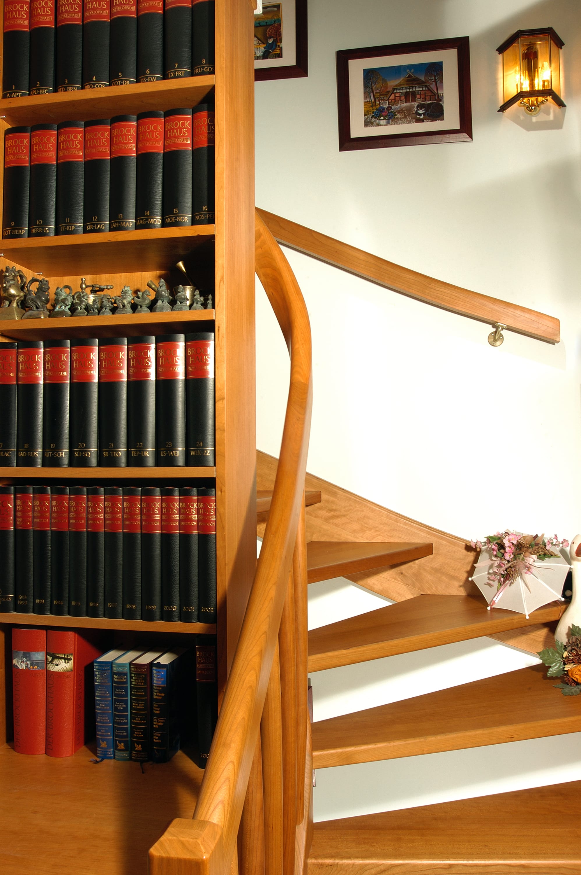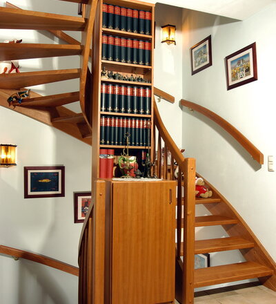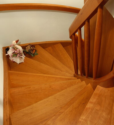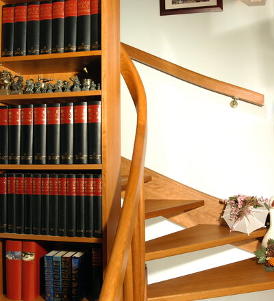 1/2 gewendelte, eingestemmte, offenen Wangentreppe in der Holzart Kirschbaum mit maßgefertigtem Bücherregal im Treppenauge.