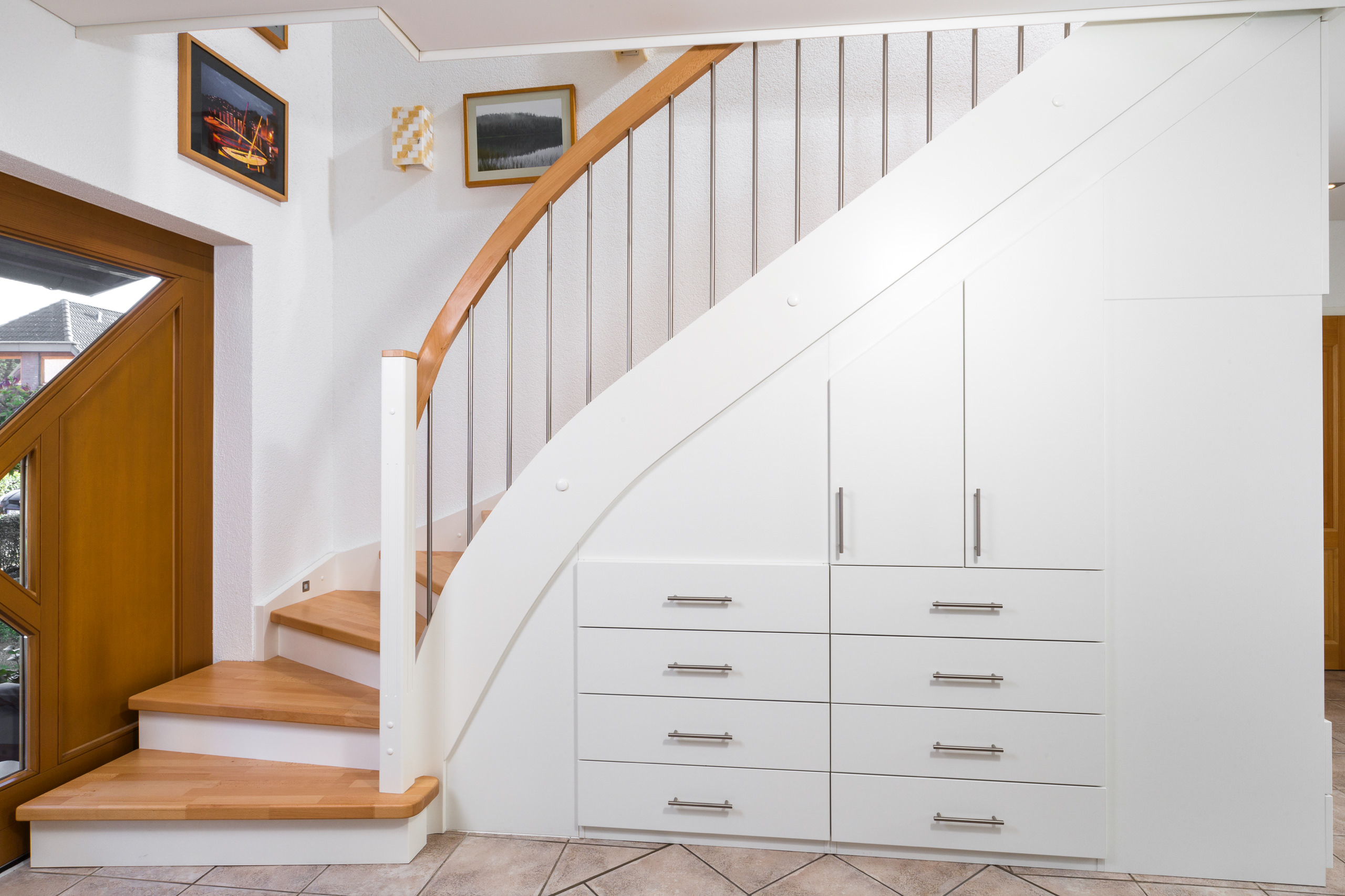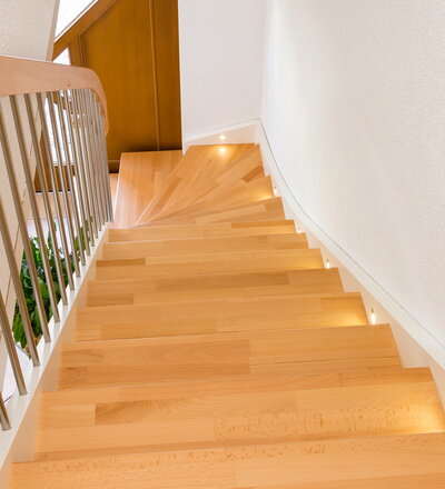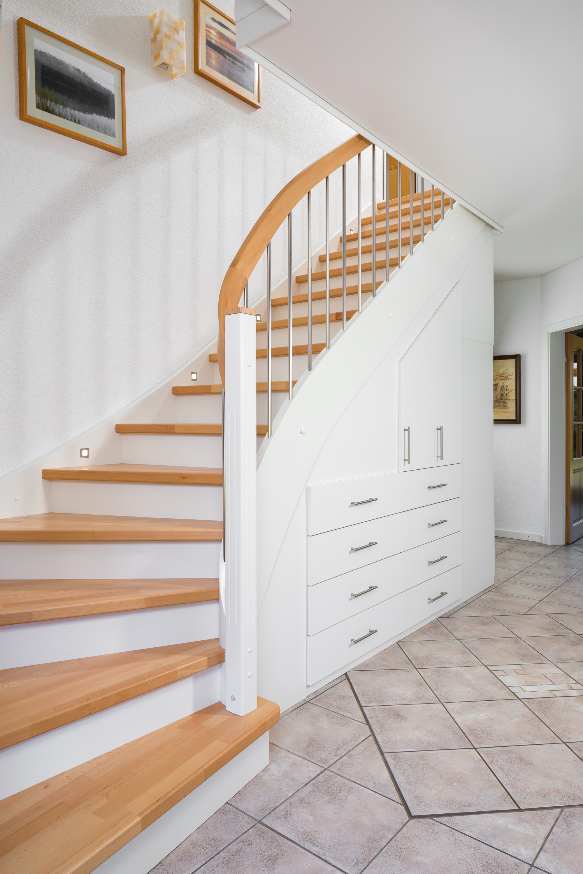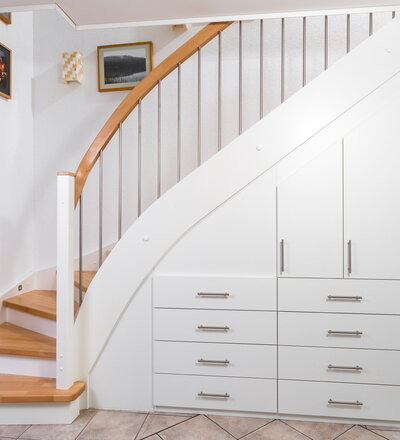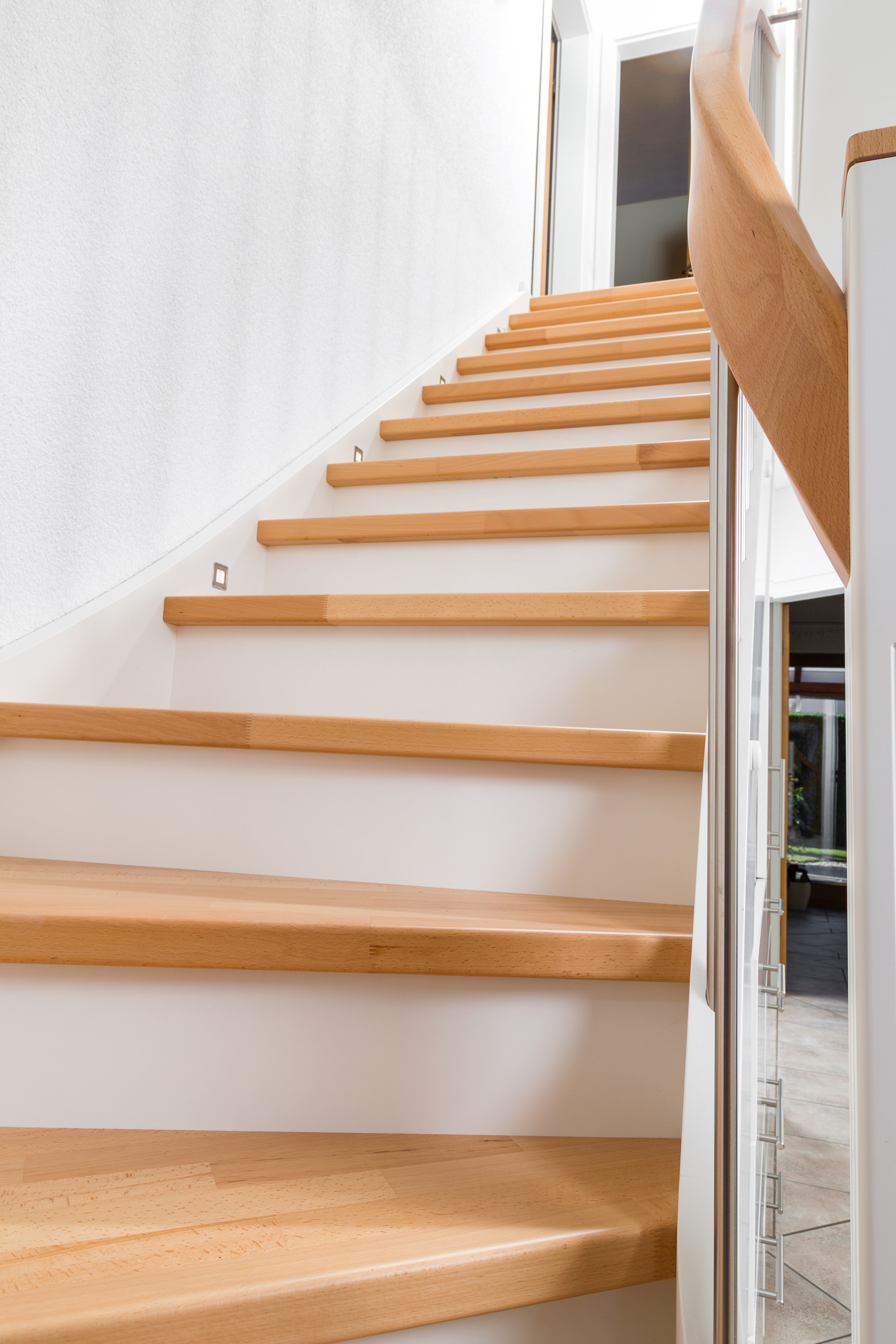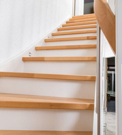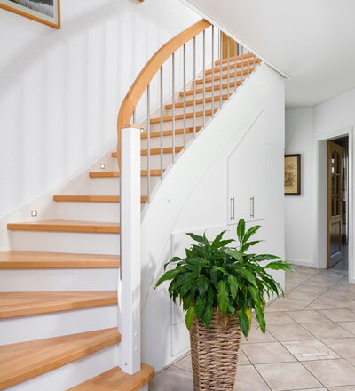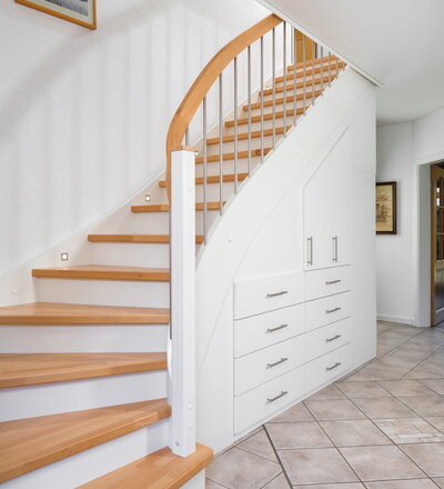 Beidseitig eingestemmte, geschlossene Wangentreppe mit Unterbauschrank und Stellwand. Stufen und Handlauf in der Holzart Buche mosaik farblos lackiert, Wangen, Pfosten und Setzstufen weiß endlackiert.
