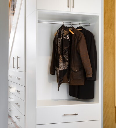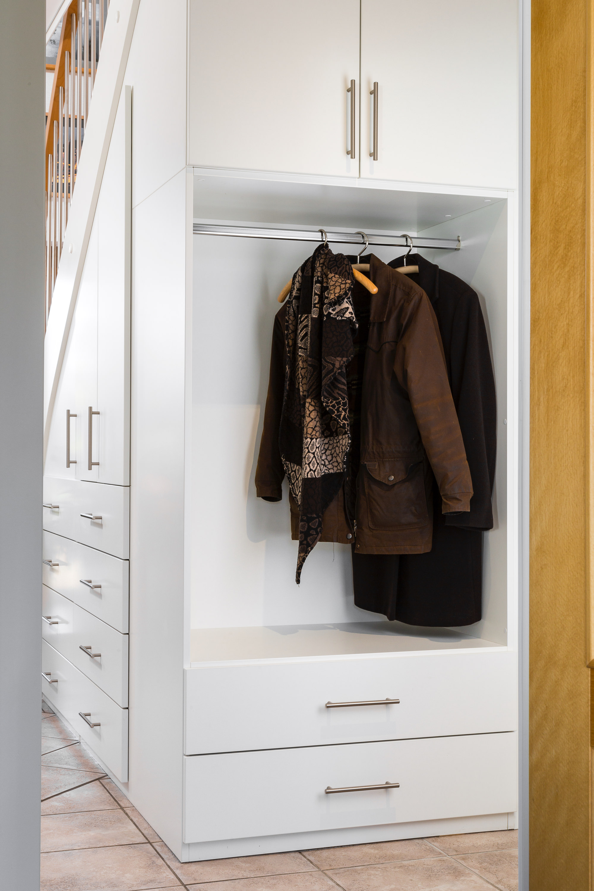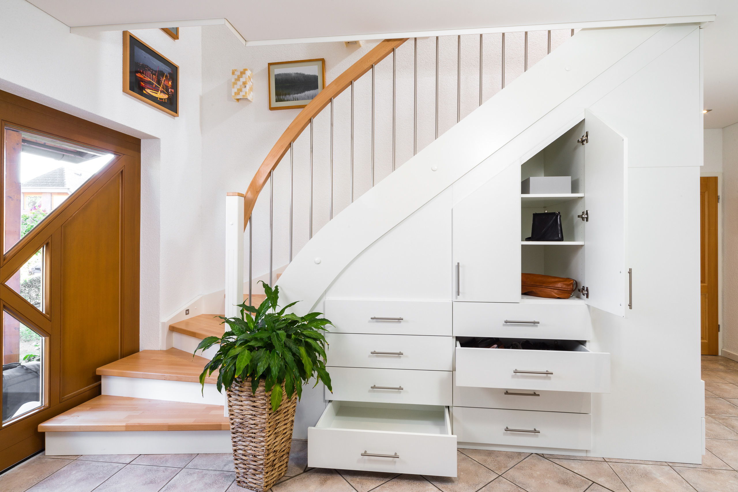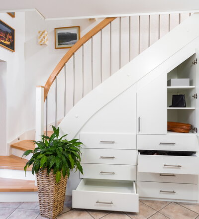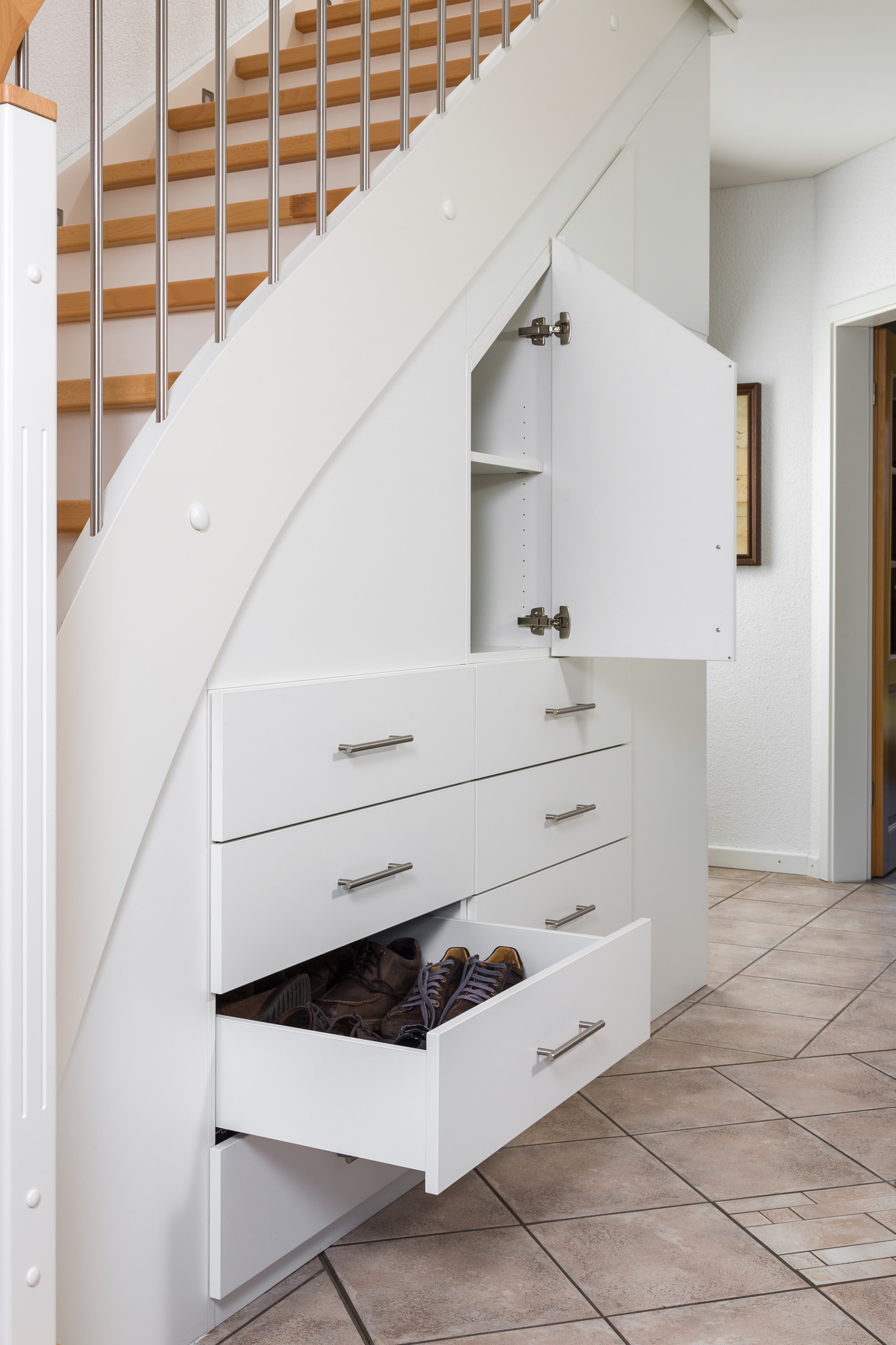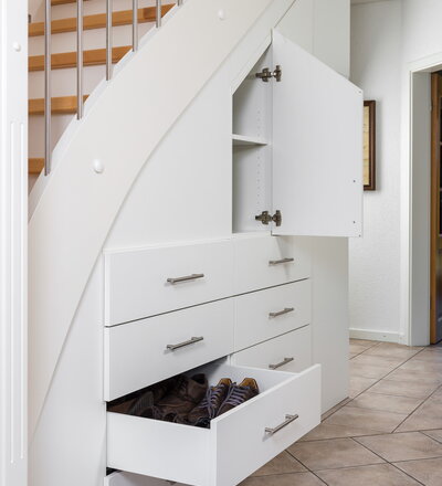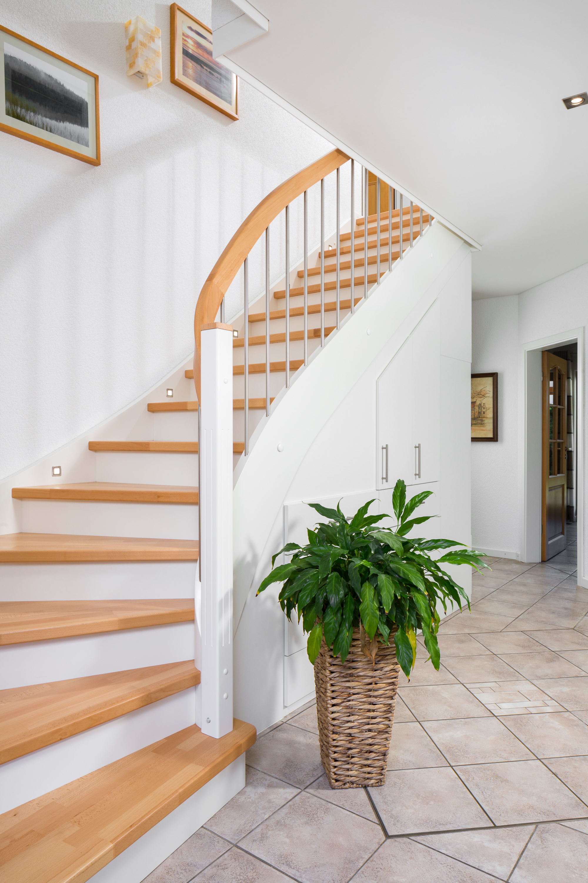 Beidseitig eingestemmte, geschlossene Wangentreppe mit Unterbauschrank und Stellwand. Stufen und Handlauf in der Holzart Buche mosaik farblos lackiert, Wangen, Pfosten und Setzstufen weiß endlackiert.
