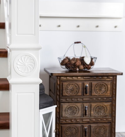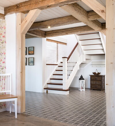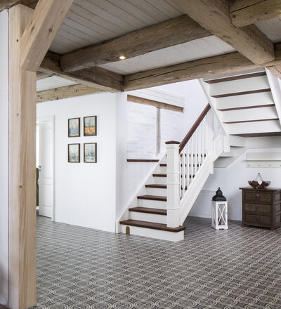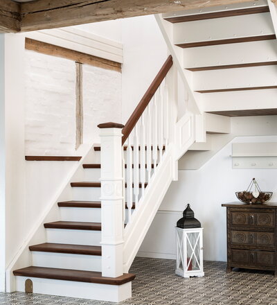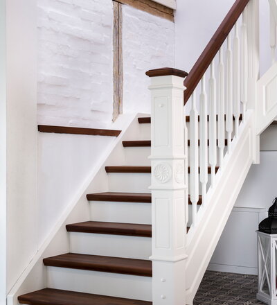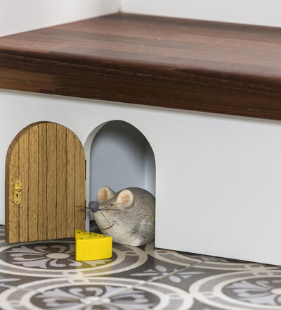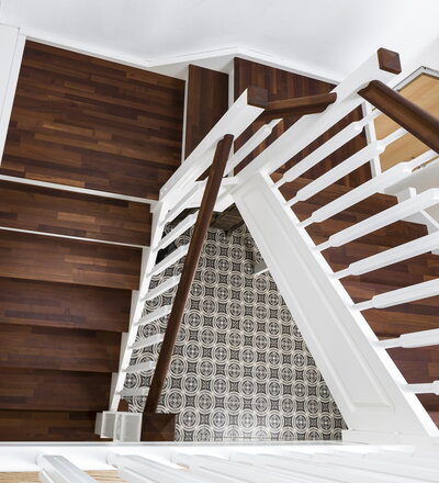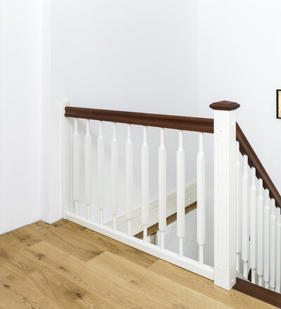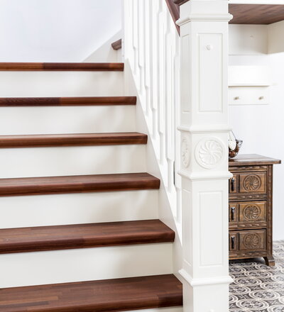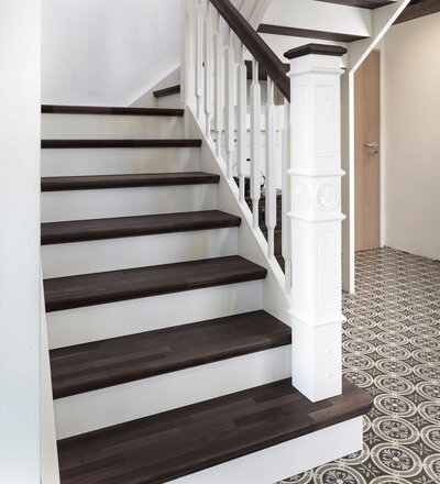 Geschlossene eingestemmte Wangentreppe, Stufen, Handlauf und Pfostenkopf in der Holzart Akazie mosaik Pure (farblos) geölt, Wangen profiliert, Pfosten nach Kundenentwurf gefertigt, Mausetür nach Kundenwunsch gefertigt