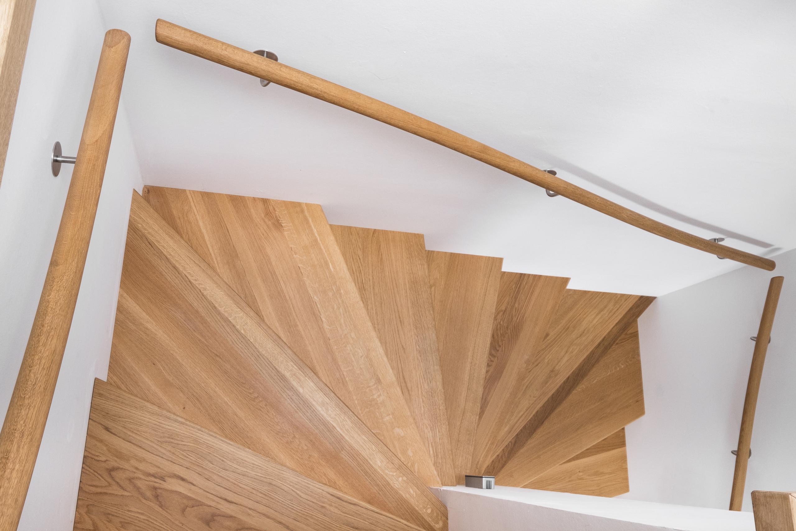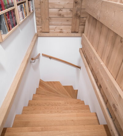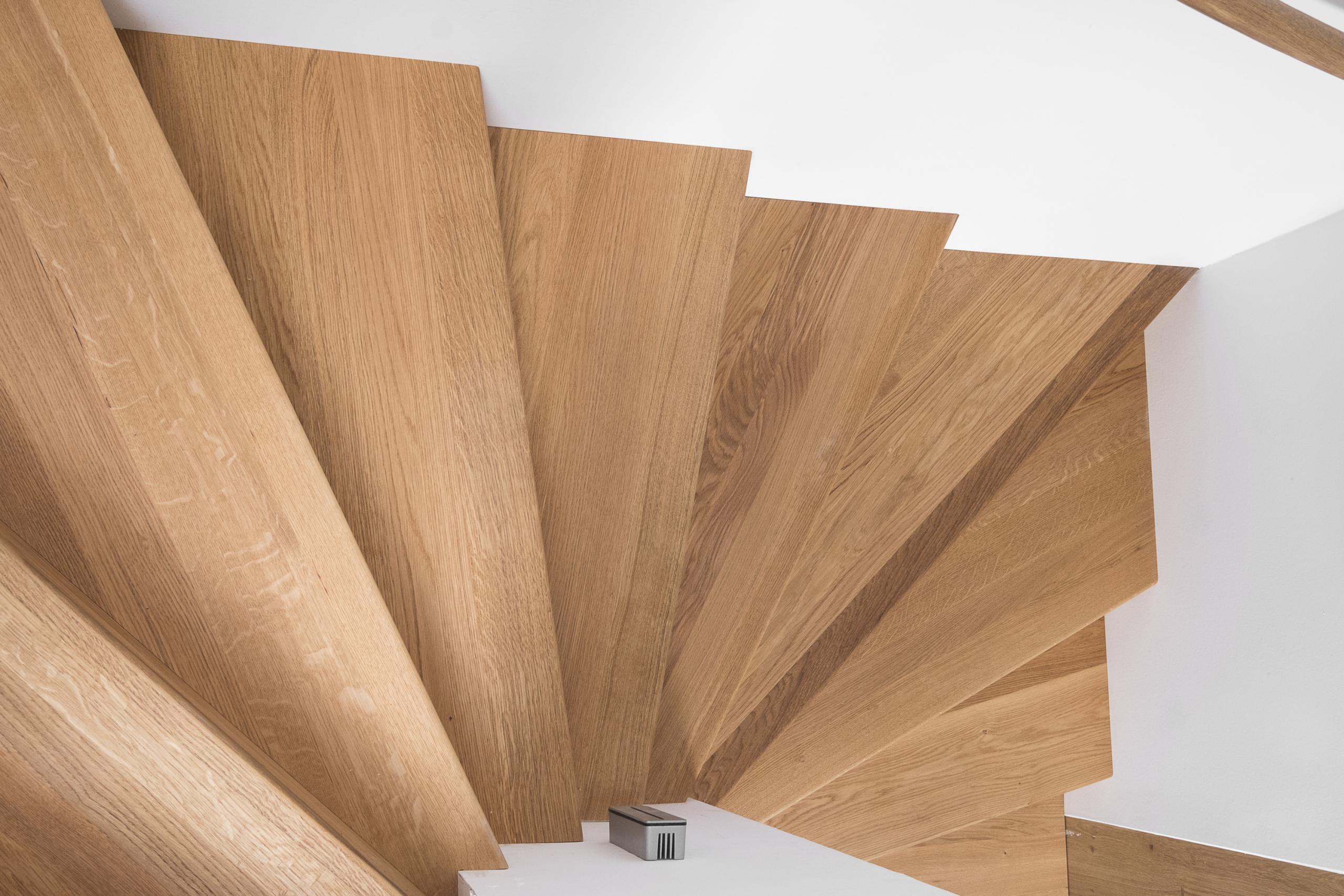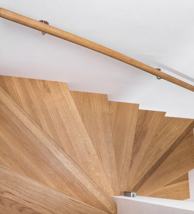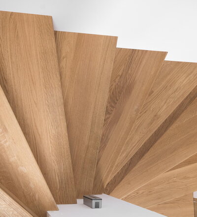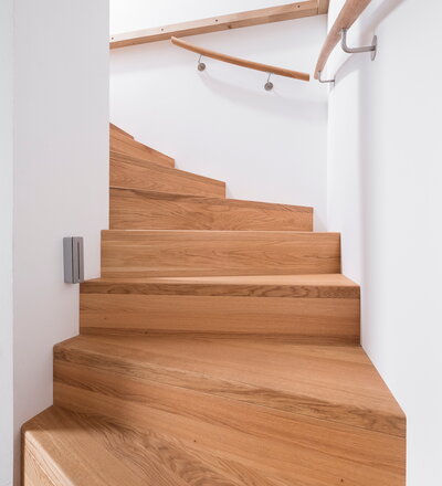 Aufgesattelte Wangentreppe in Faltwerkoptik zwischen zwei Wänden in der Holzart Eiche Pure (farblos) geölt mit TBV Echtholz-Öl