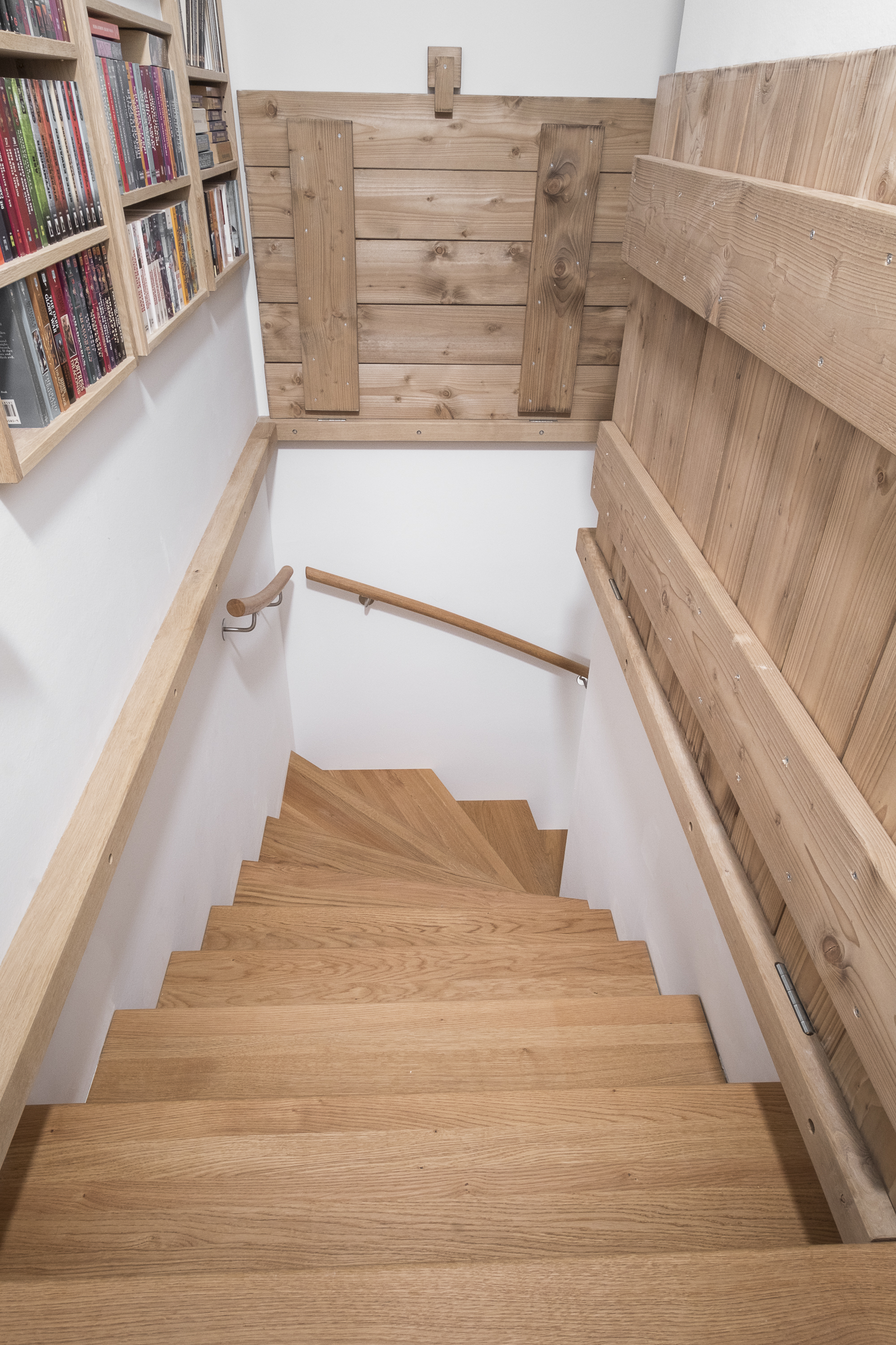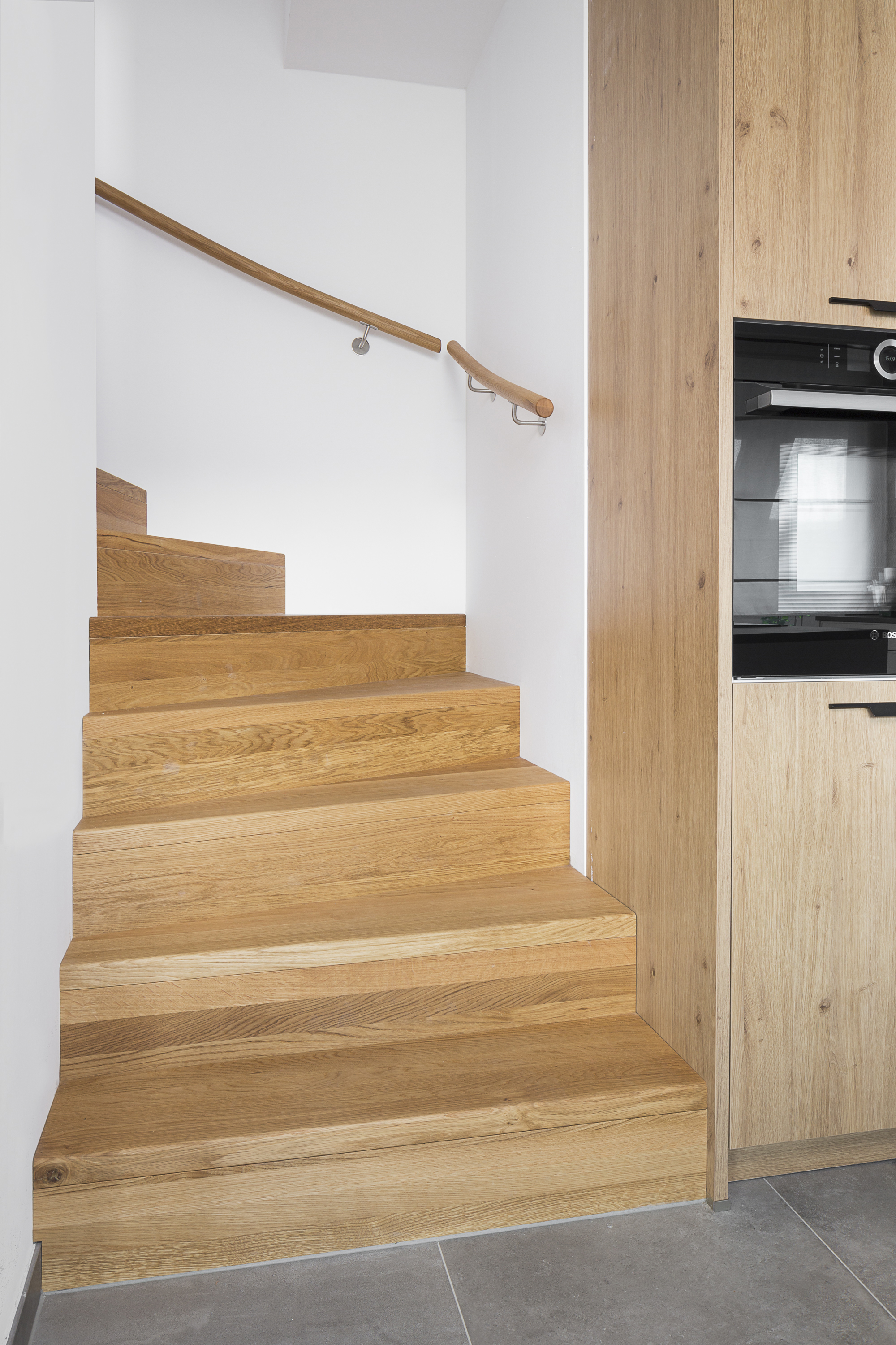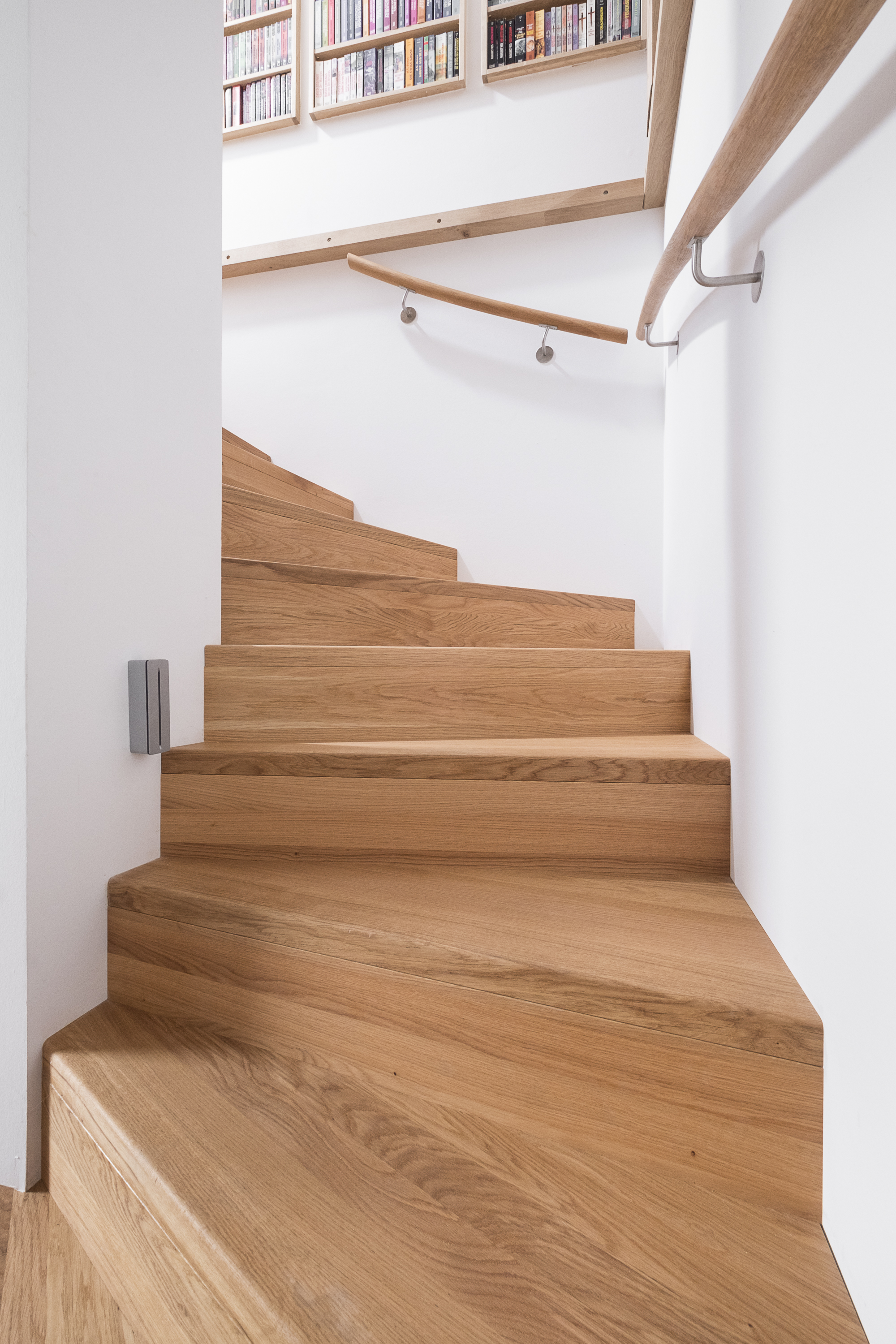 Aufgesattelte Wangentreppe in Faltwerkoptik zwischen zwei Wänden in der Holzart Eiche Pure (farblos) geölt mit TBV Echtholz-Öl