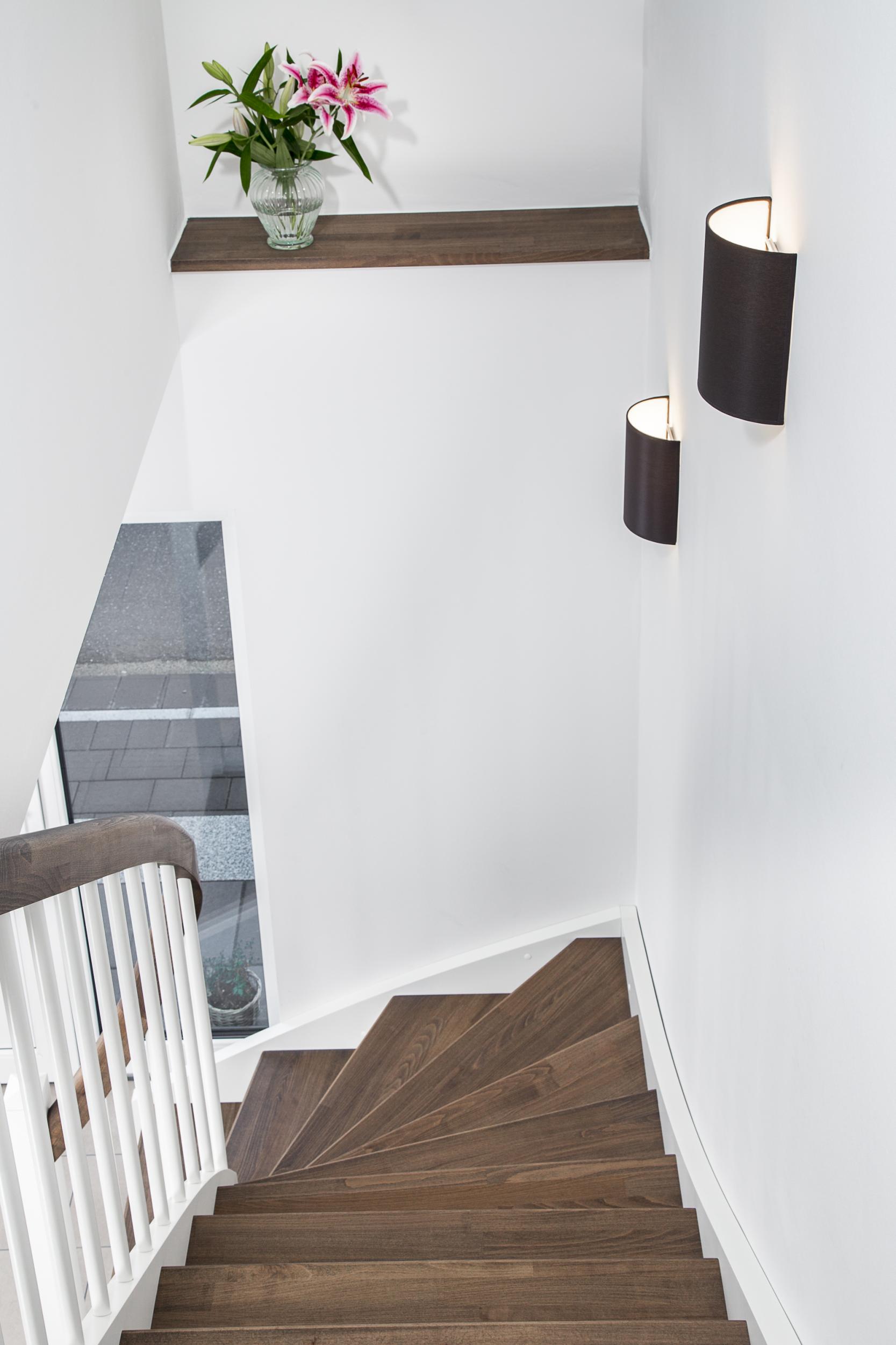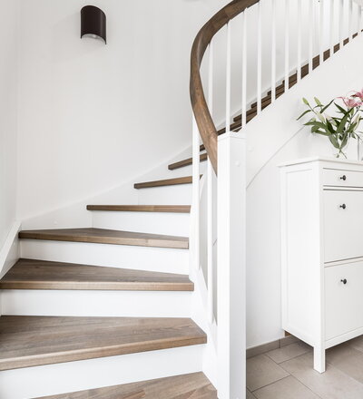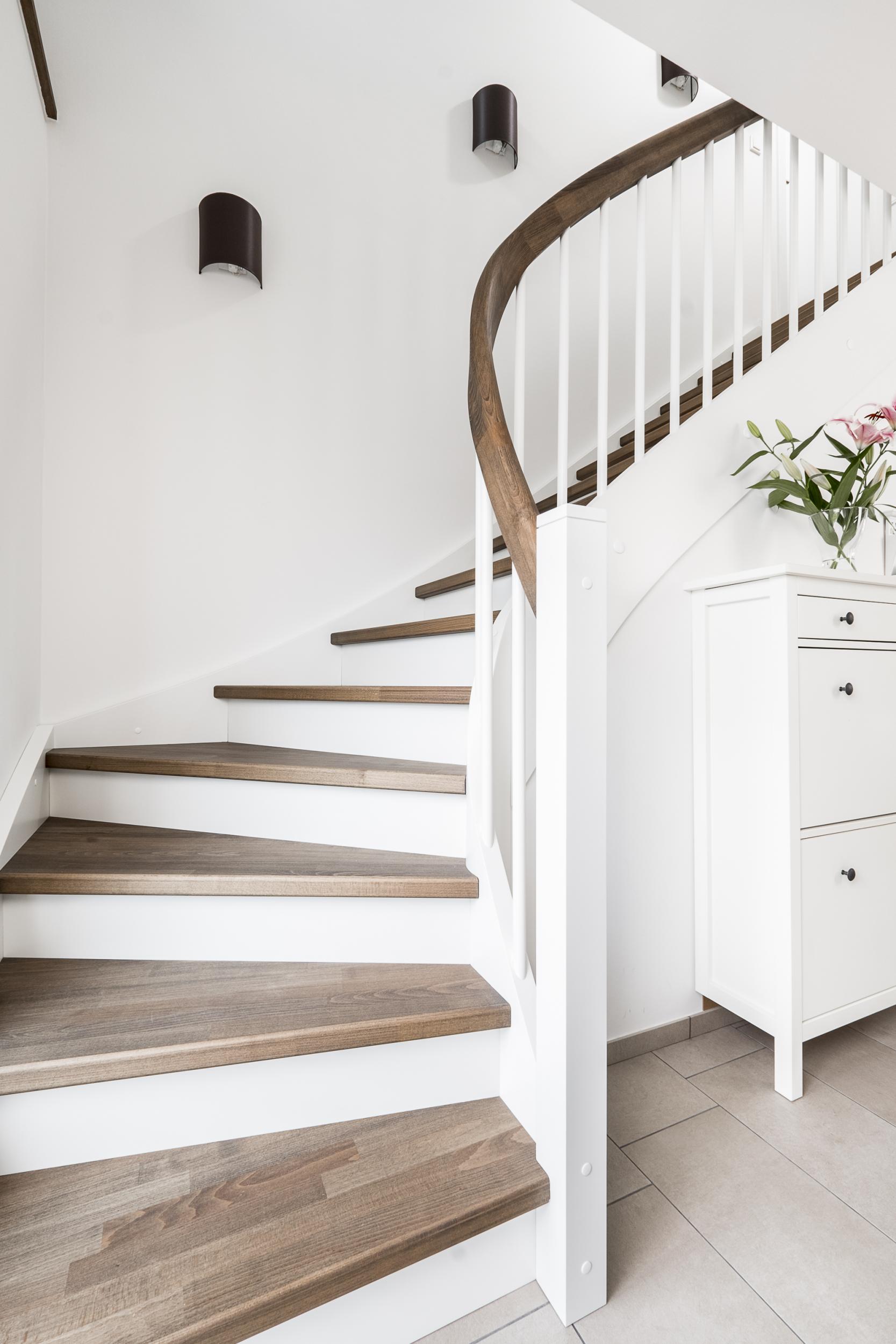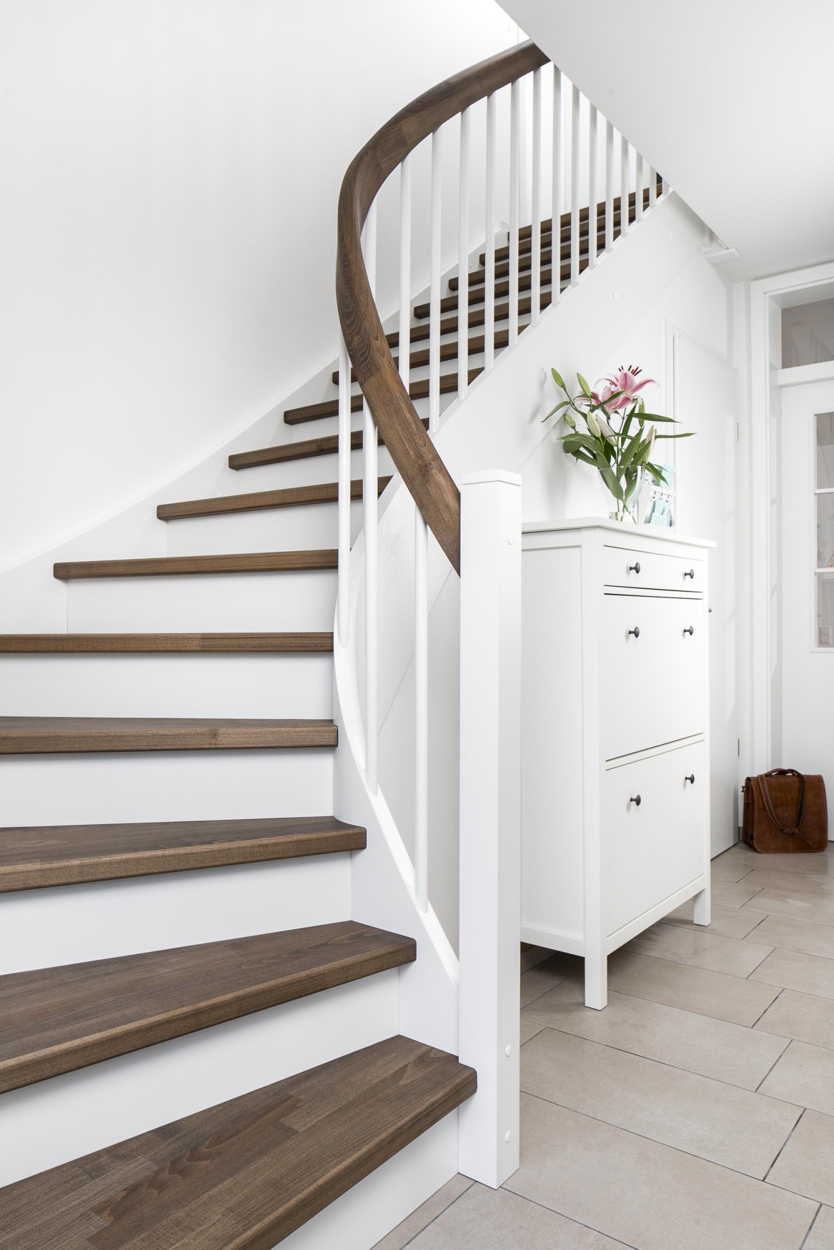 Eingestemmte, geschlossene Wangentreppe mit Stellwand, 1/4 gewendelt, Stufen und Handlauf (mit Krümmling) in der Holzart Buche mosaik schwarz geölt mit TBV Echtholz-Öl V-Black, Setzstufen, Pfosten und Stäbe in der Holzart Whitewood weiß endlackiert