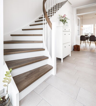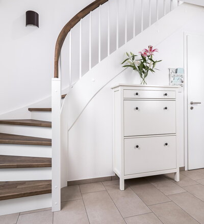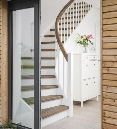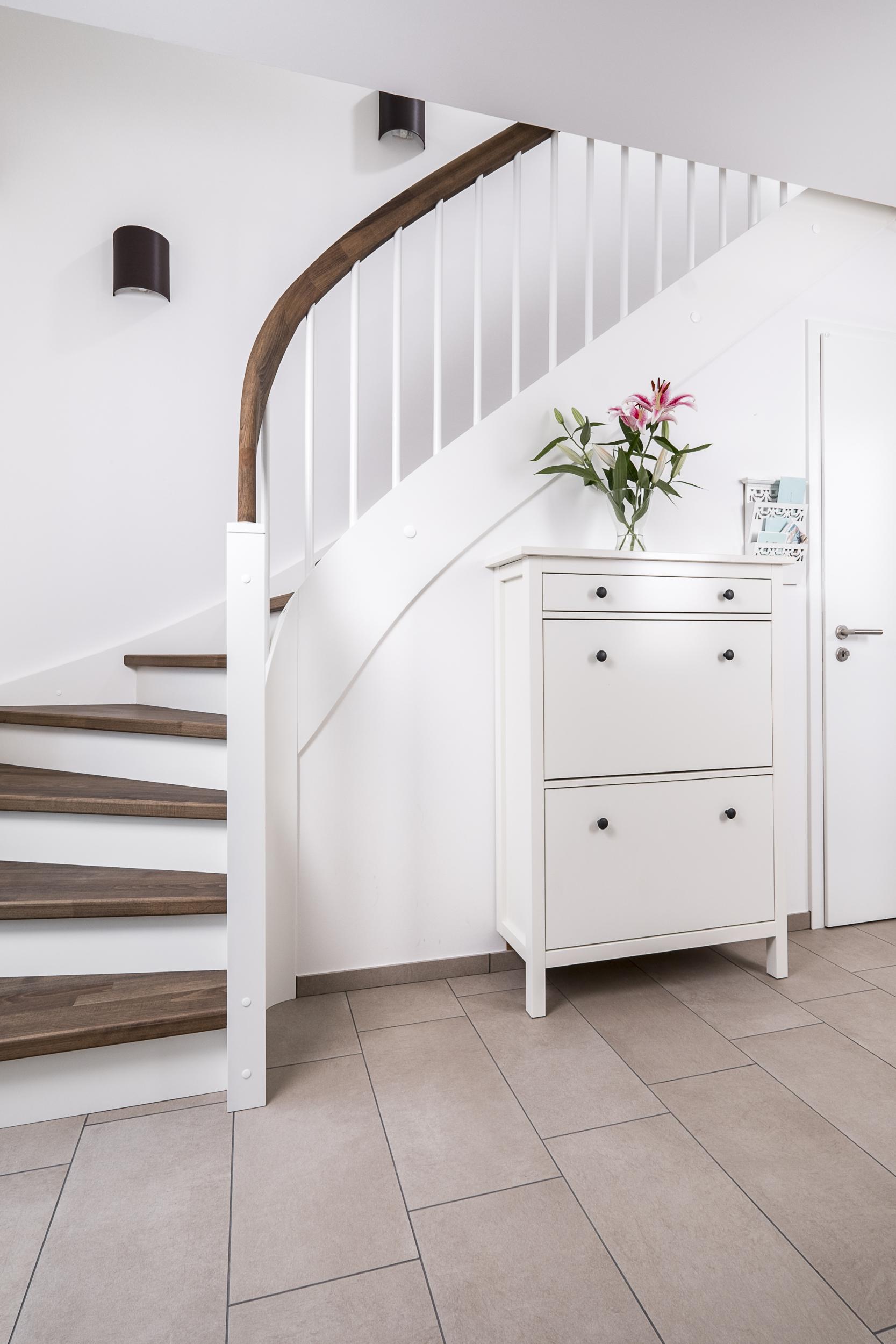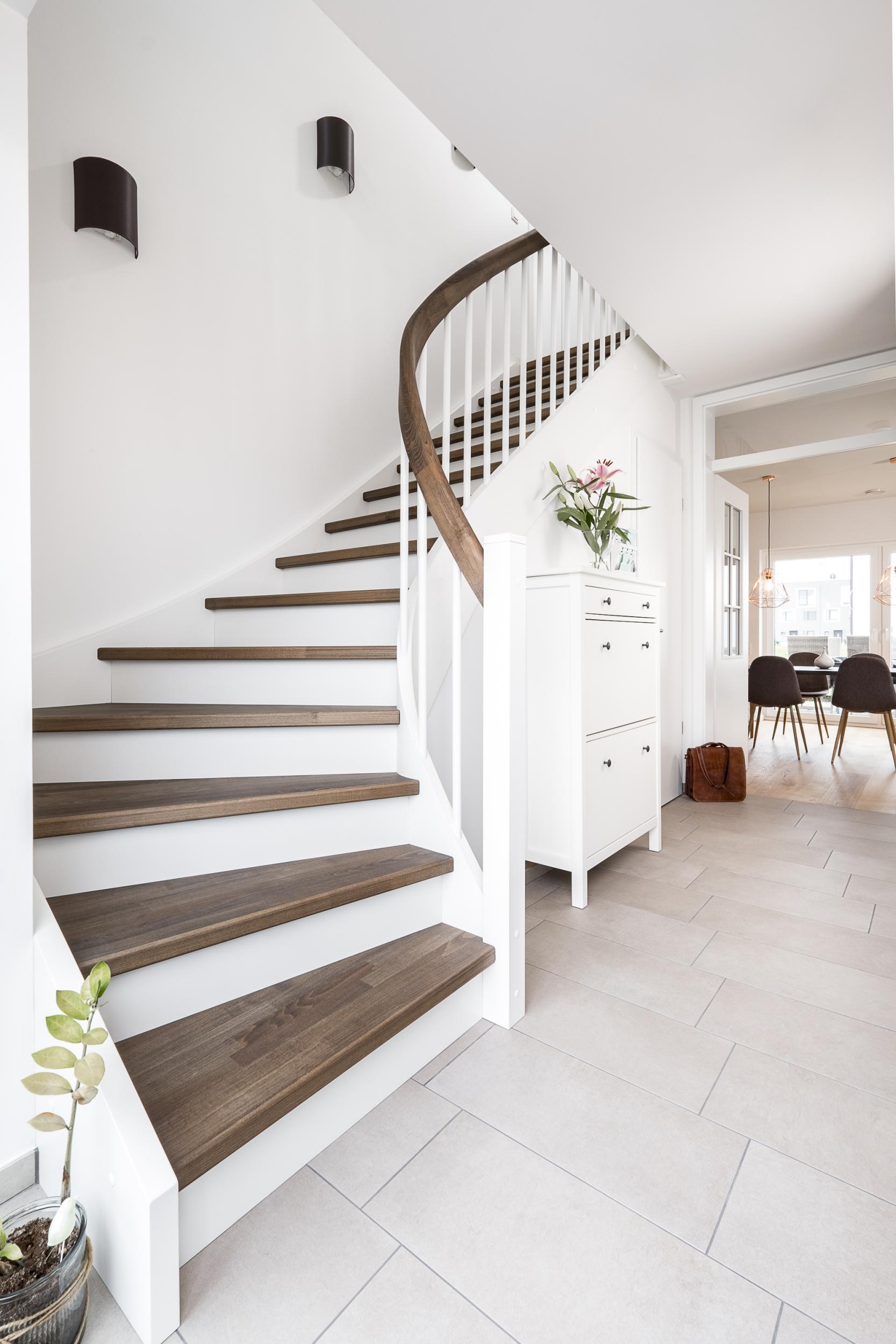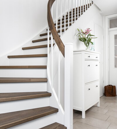Eingestemmte, geschlossene Wangentreppe mit Stellwand, 1/4 gewendelt, Stufen und Handlauf (mit Krümmling) in der Holzart Buche mosaik schwarz geölt mit TBV Echtholz-Öl V-Black, Setzstufen, Pfosten und Stäbe in der Holzart Whitewood weiß endlackiert
