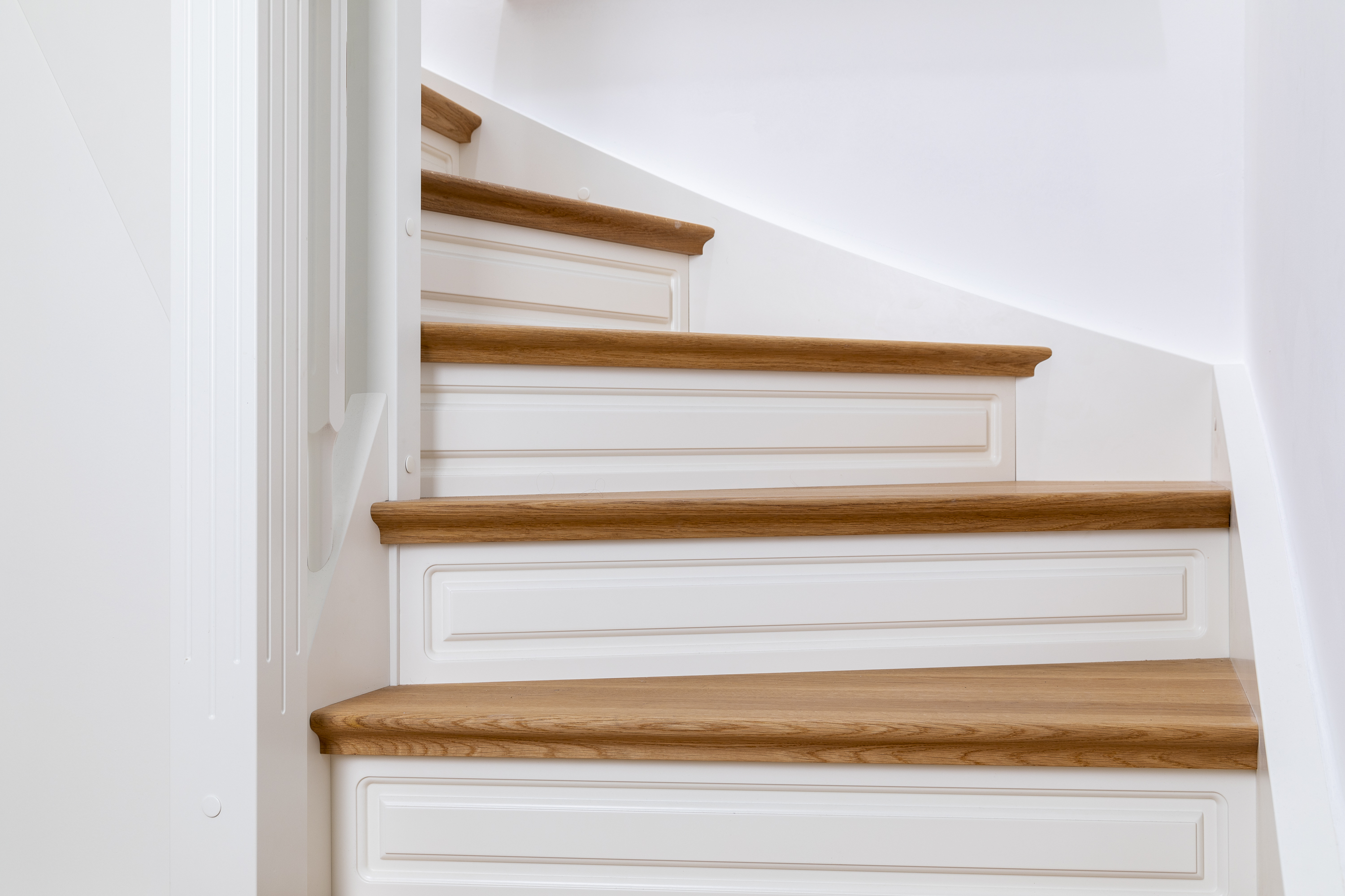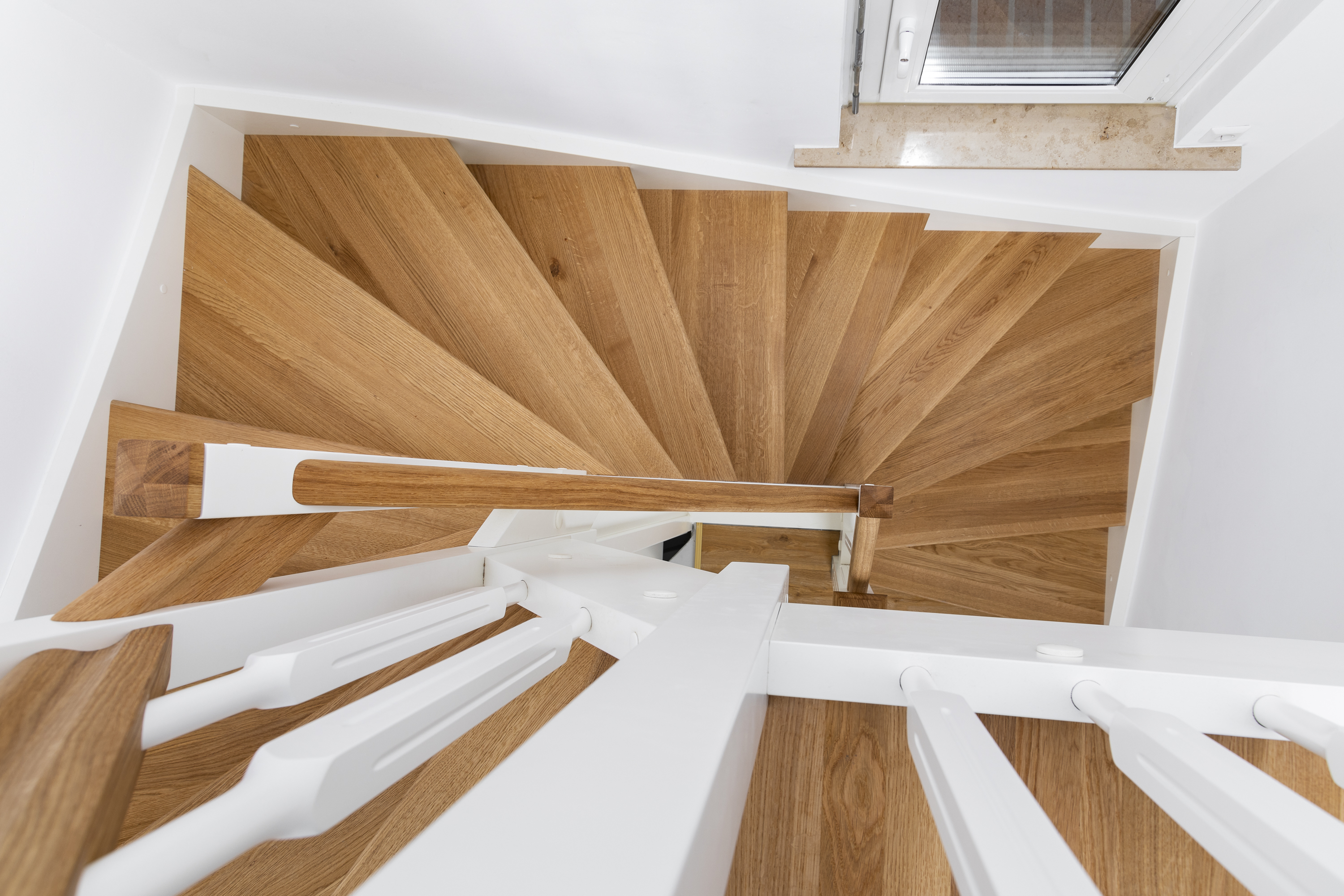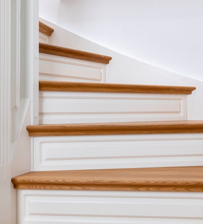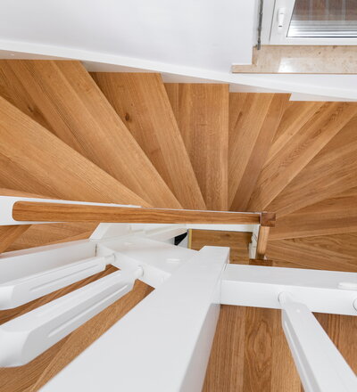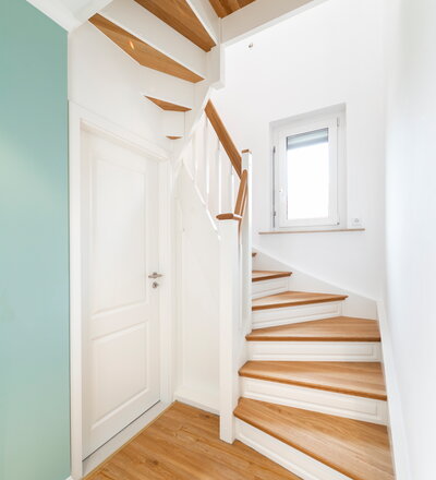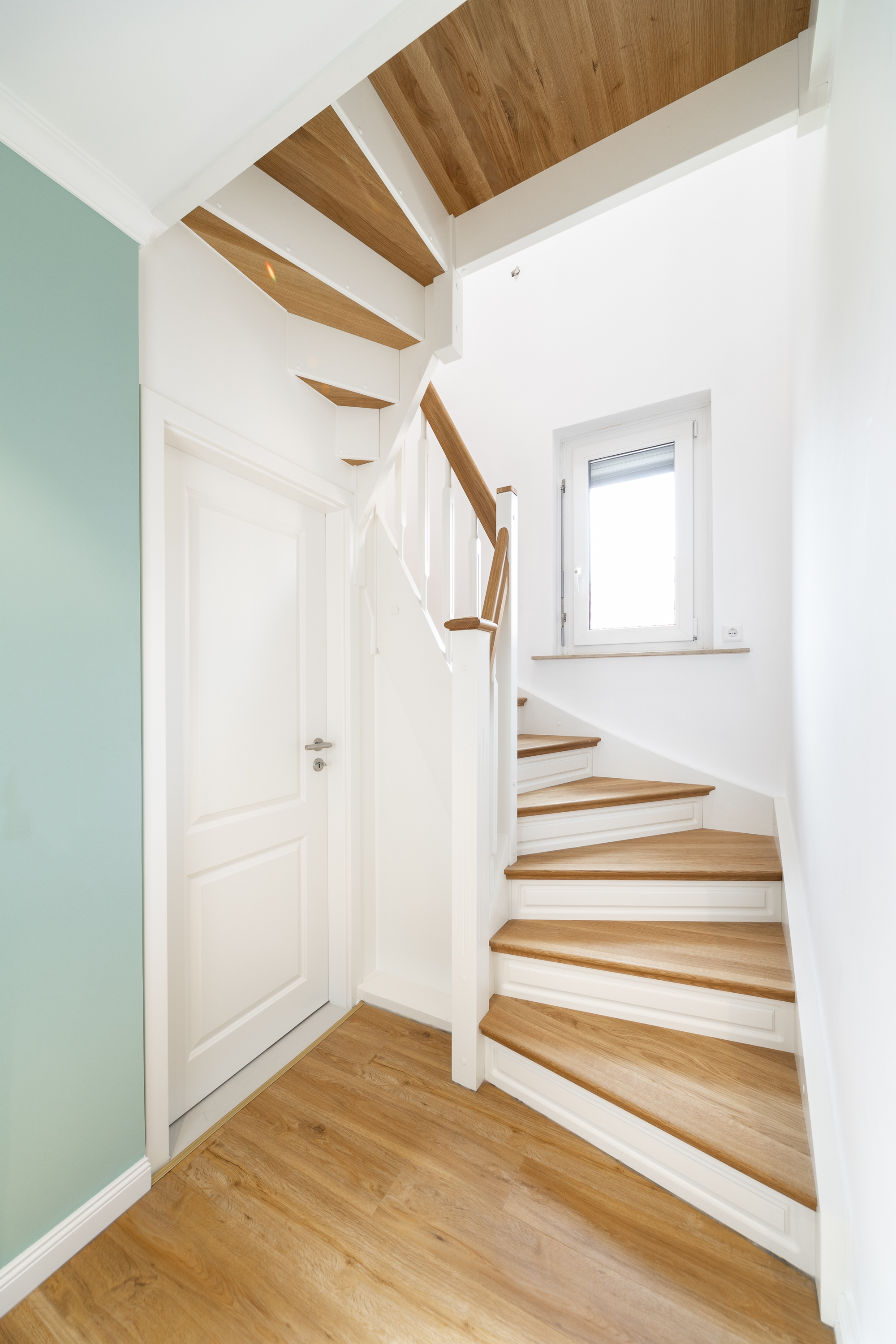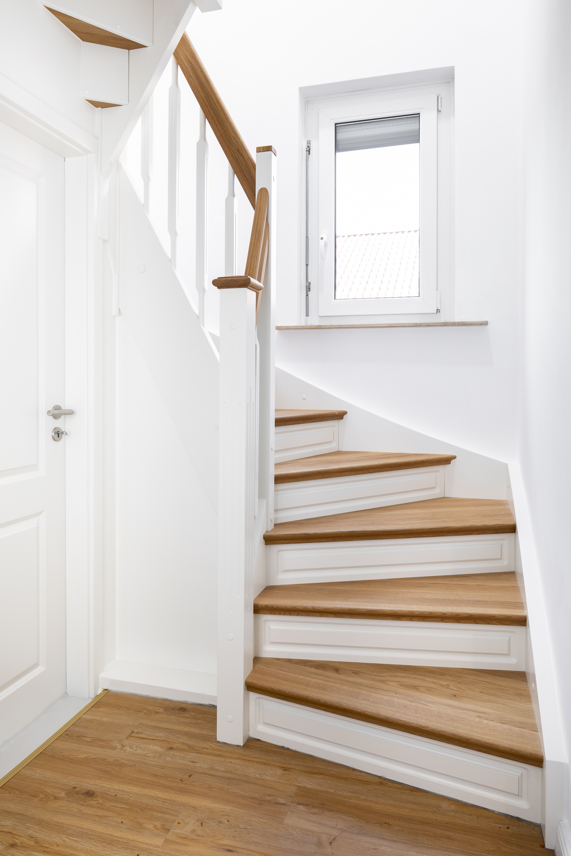 Geschlossene Wangentreppe mit Stellwand und eingefrästem Profil in die Setzstufen. Stufen und Handlauf in der Holzart Eiche farblos geölt.