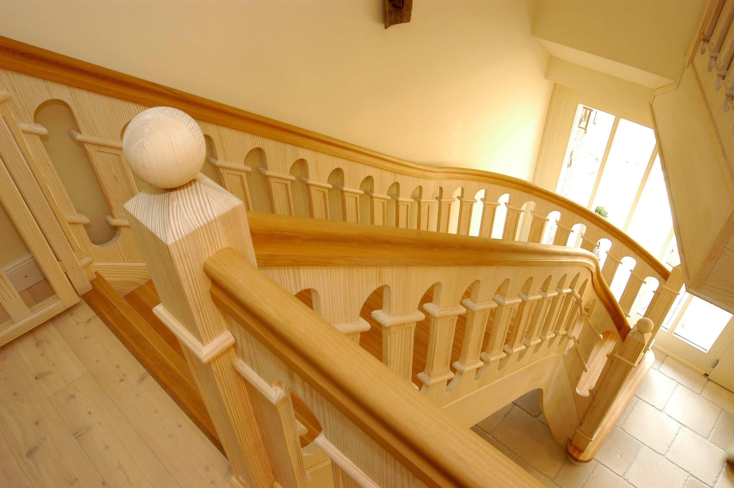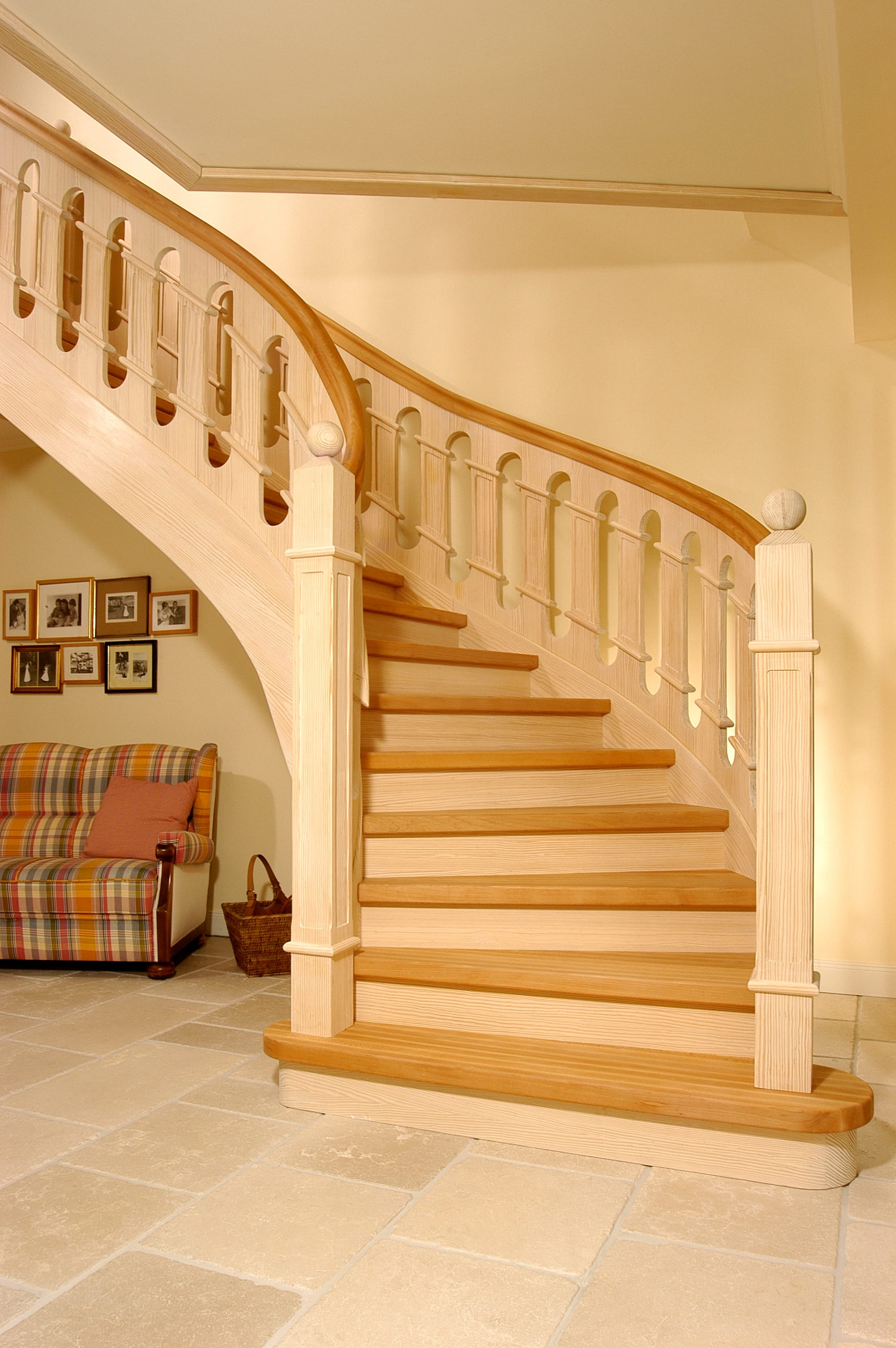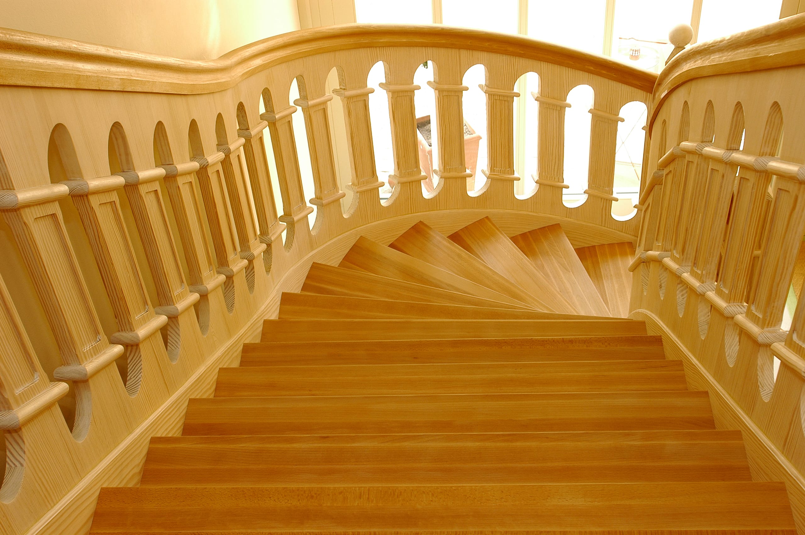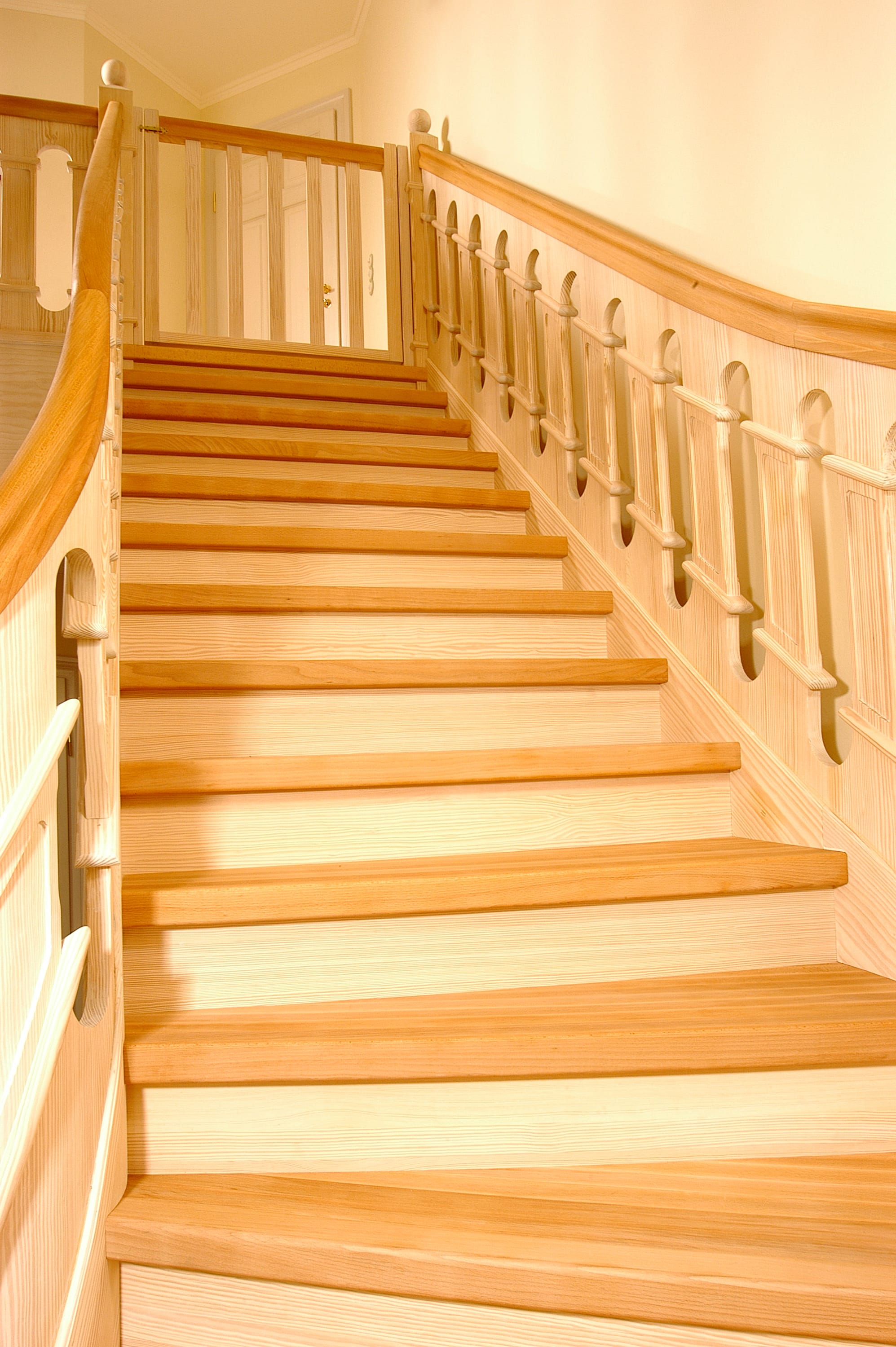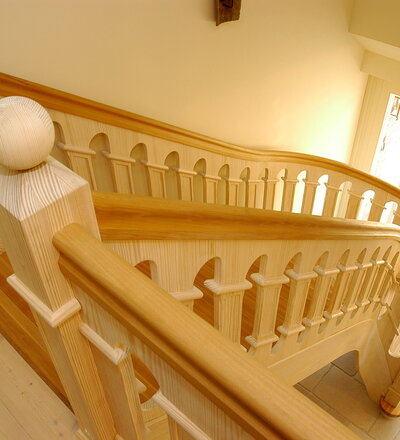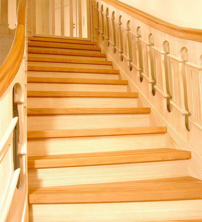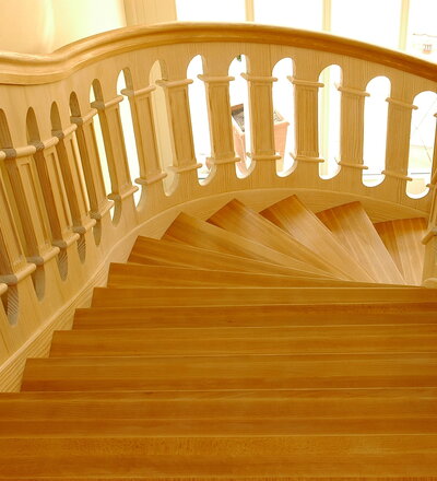Geschlossene Wangentreppe, aufwändig profilierte Geländerfüllung; Holzart Buche/Carolina Pine