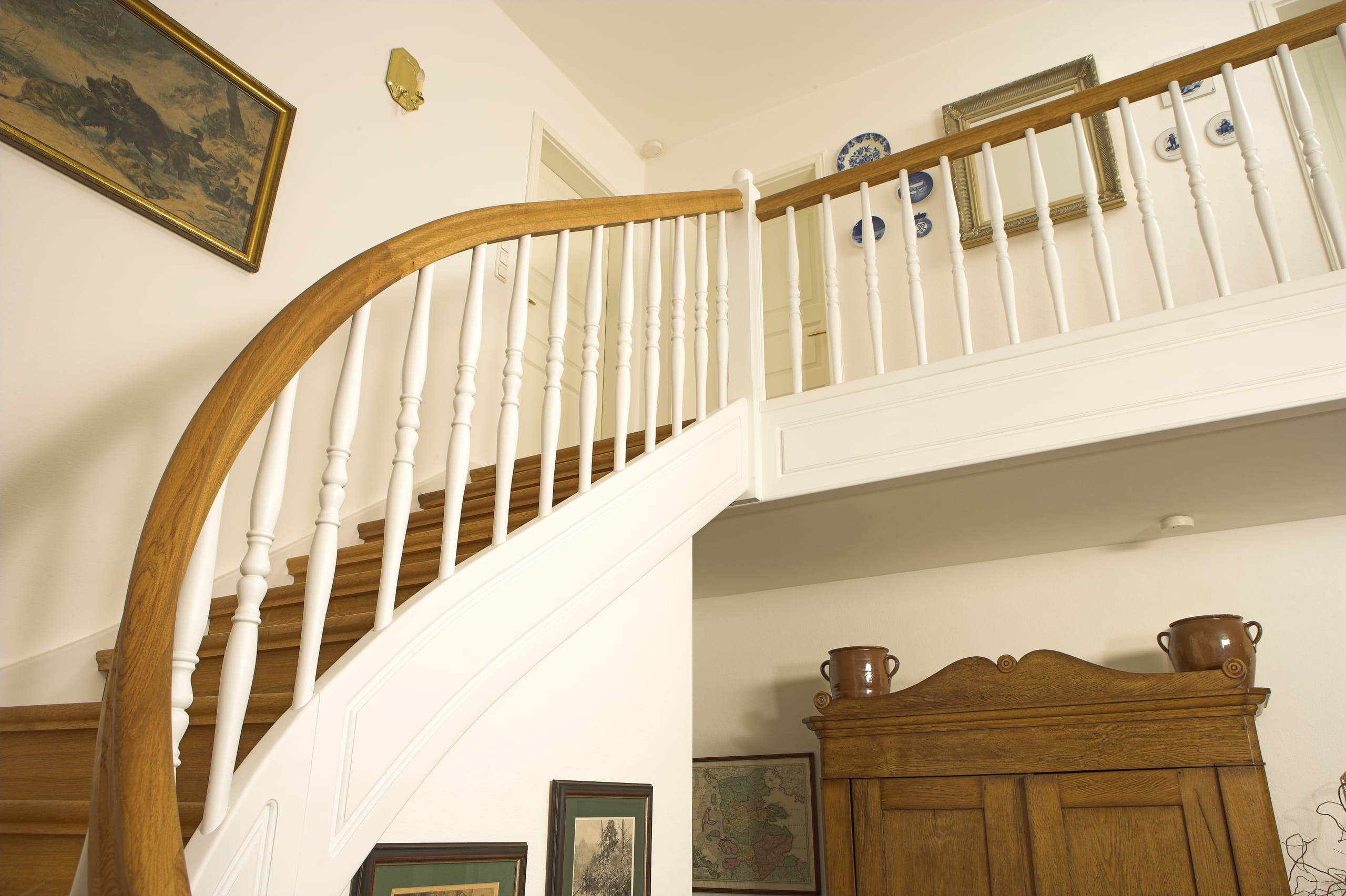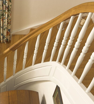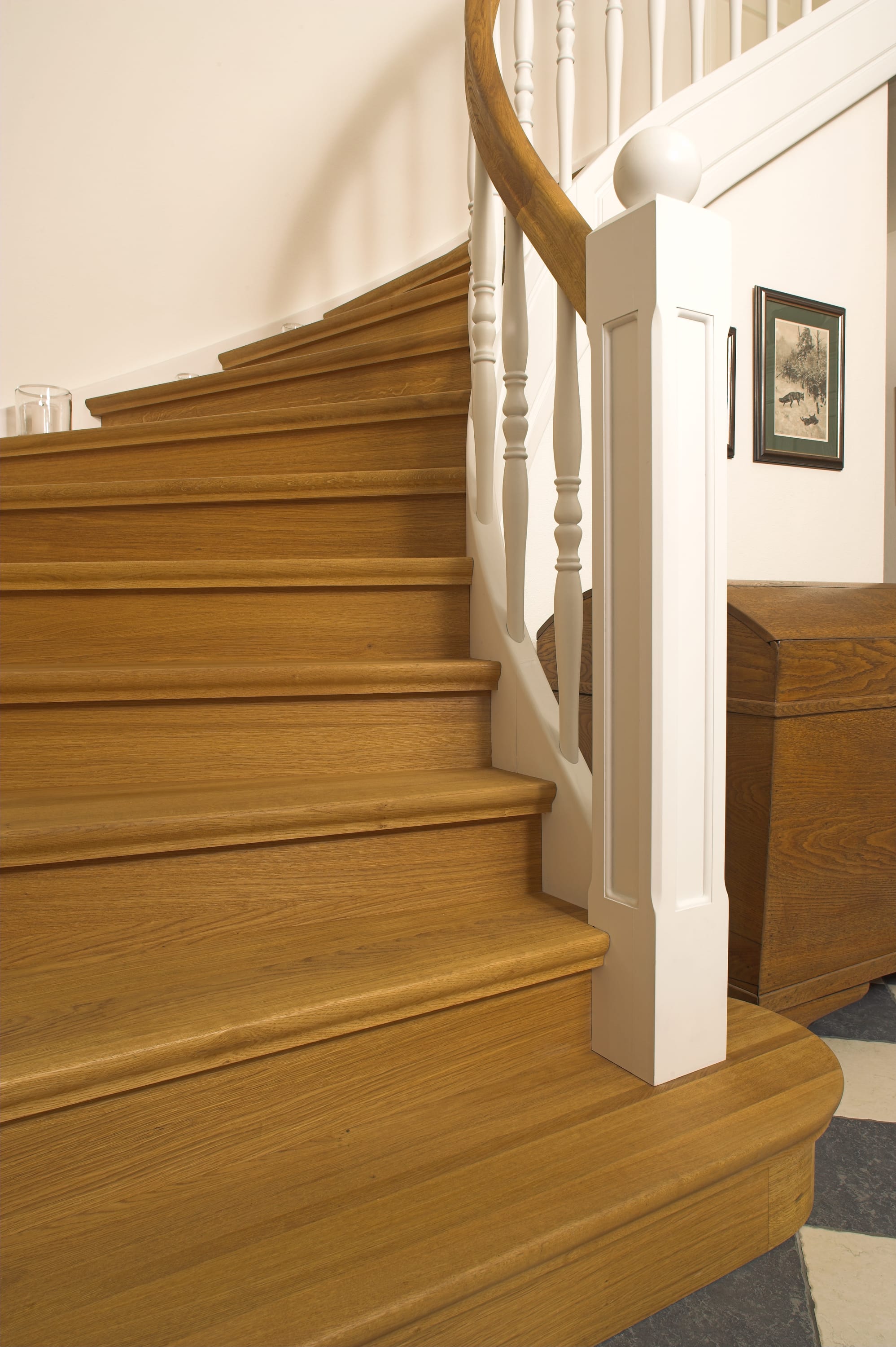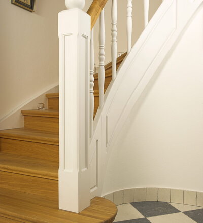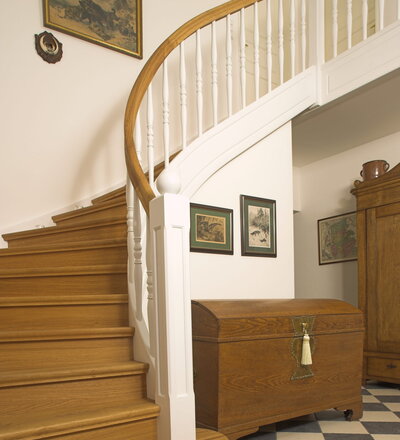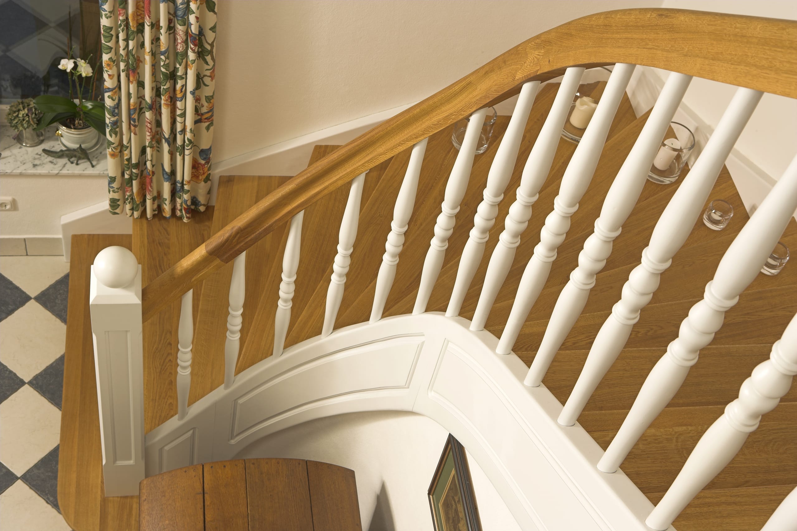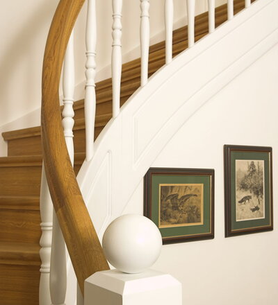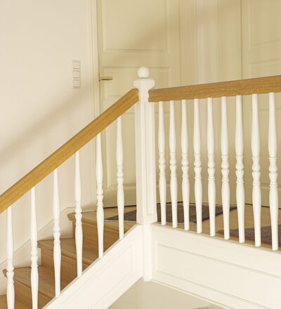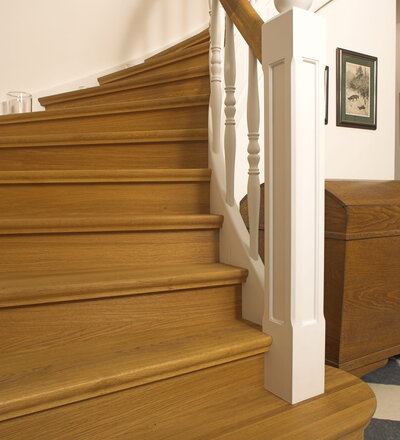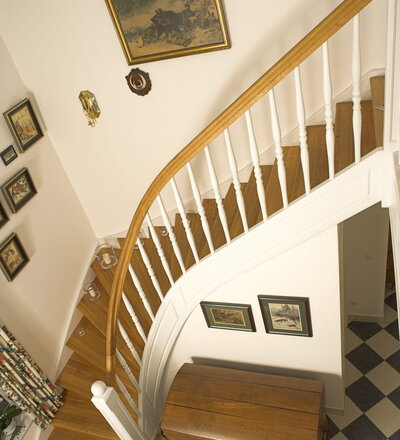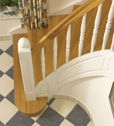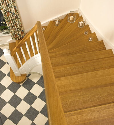 Geschlossene Wangentreppe; Holzart Eiche; Handlauf und Pfosten Holzart Whitewood weiß endlackiert, Handlauf und Wangenkrümmling im Wendel