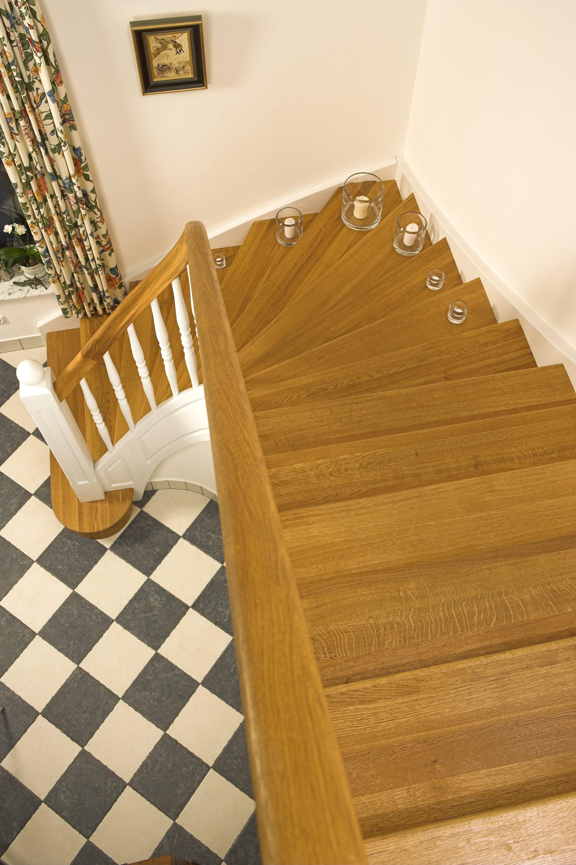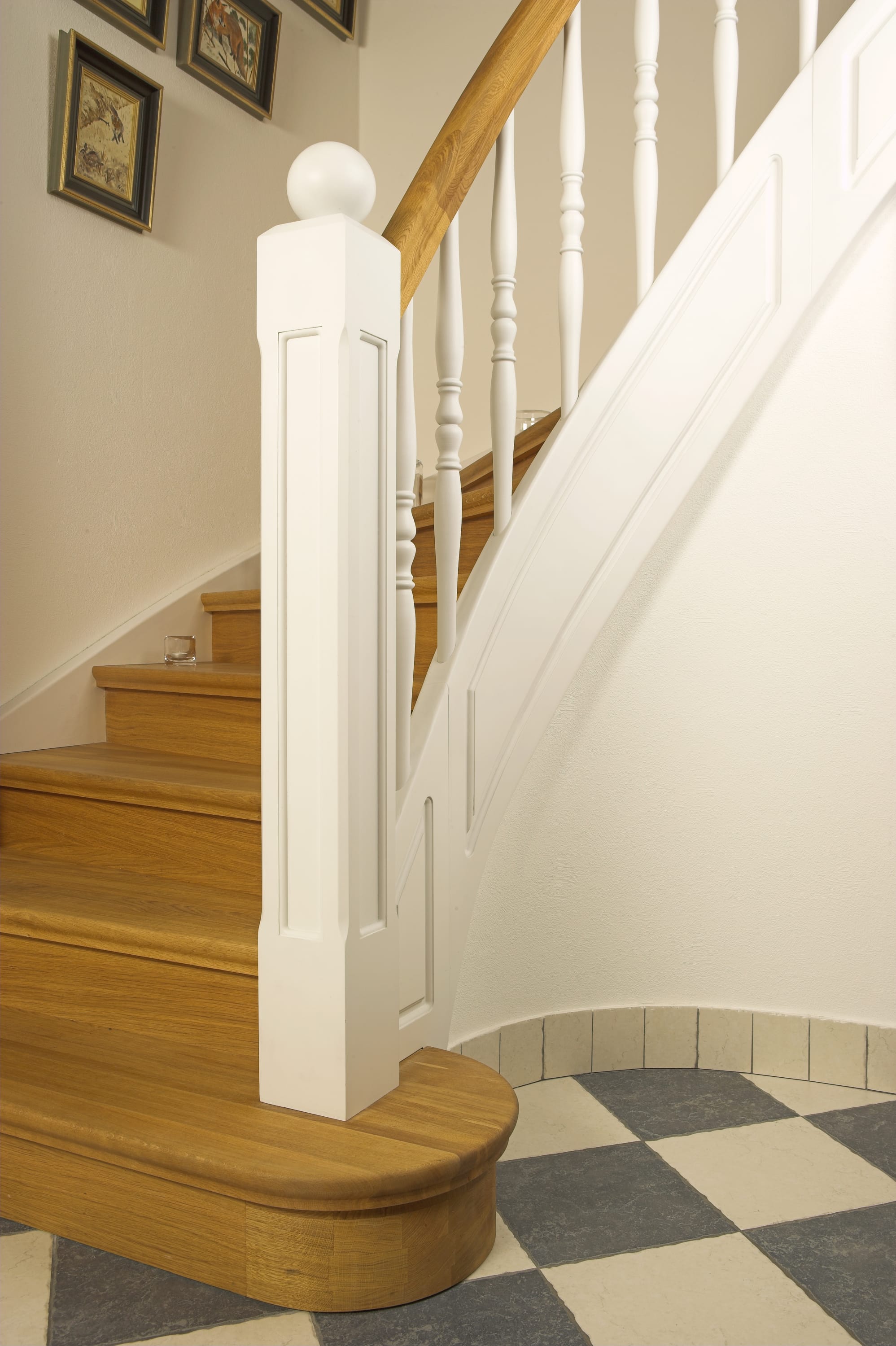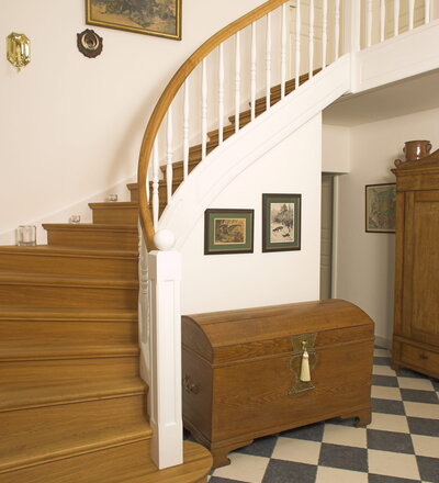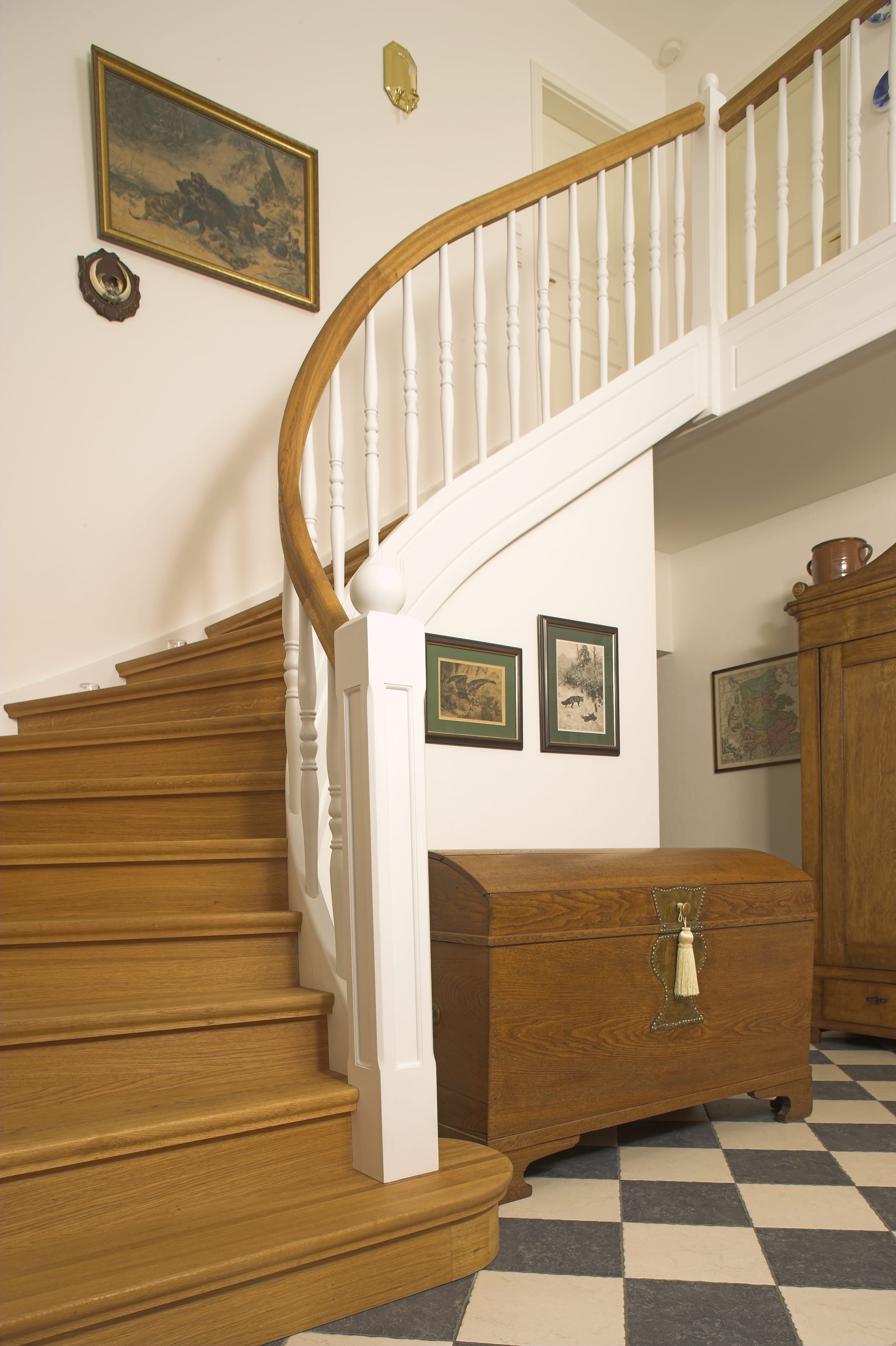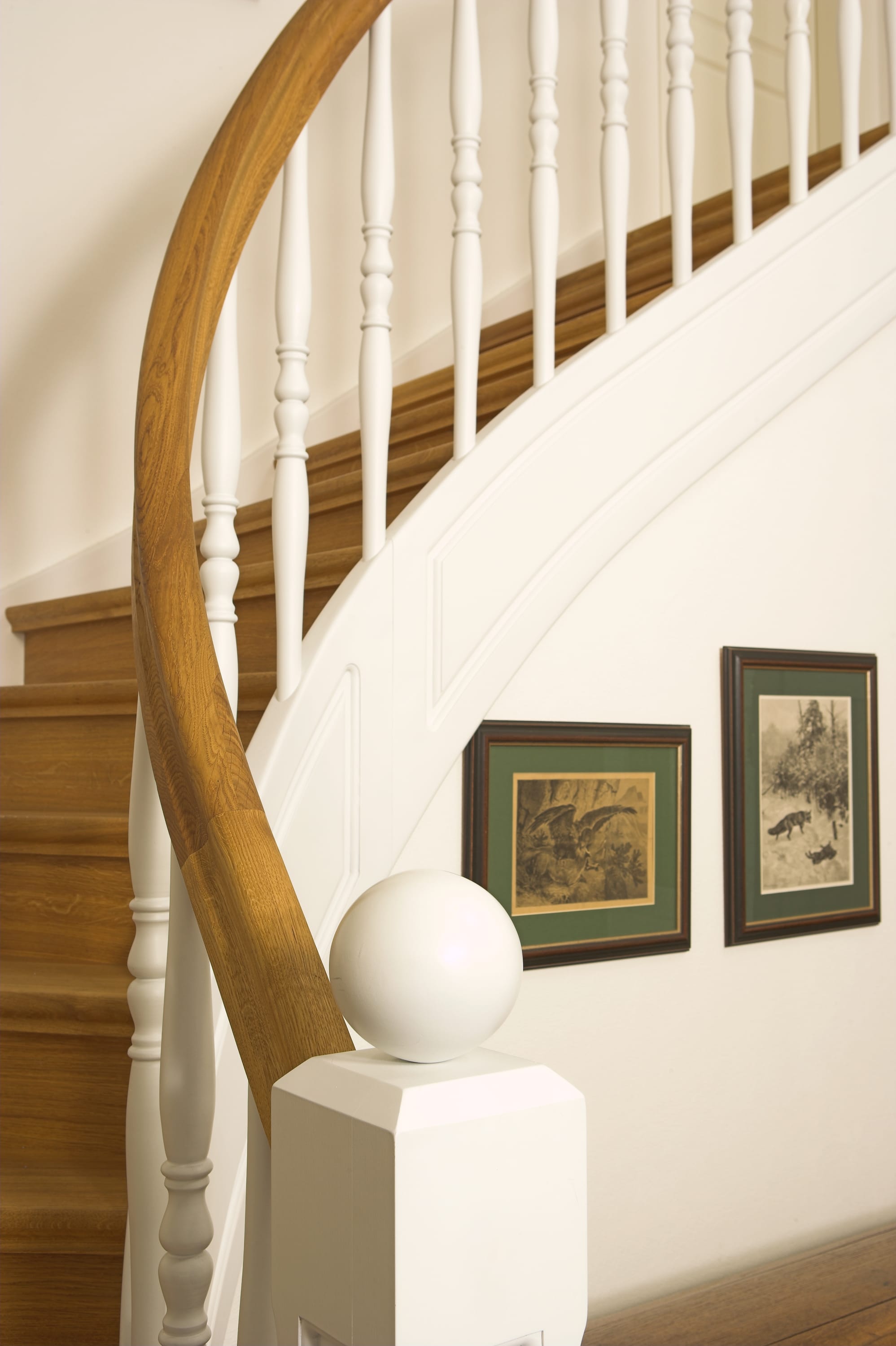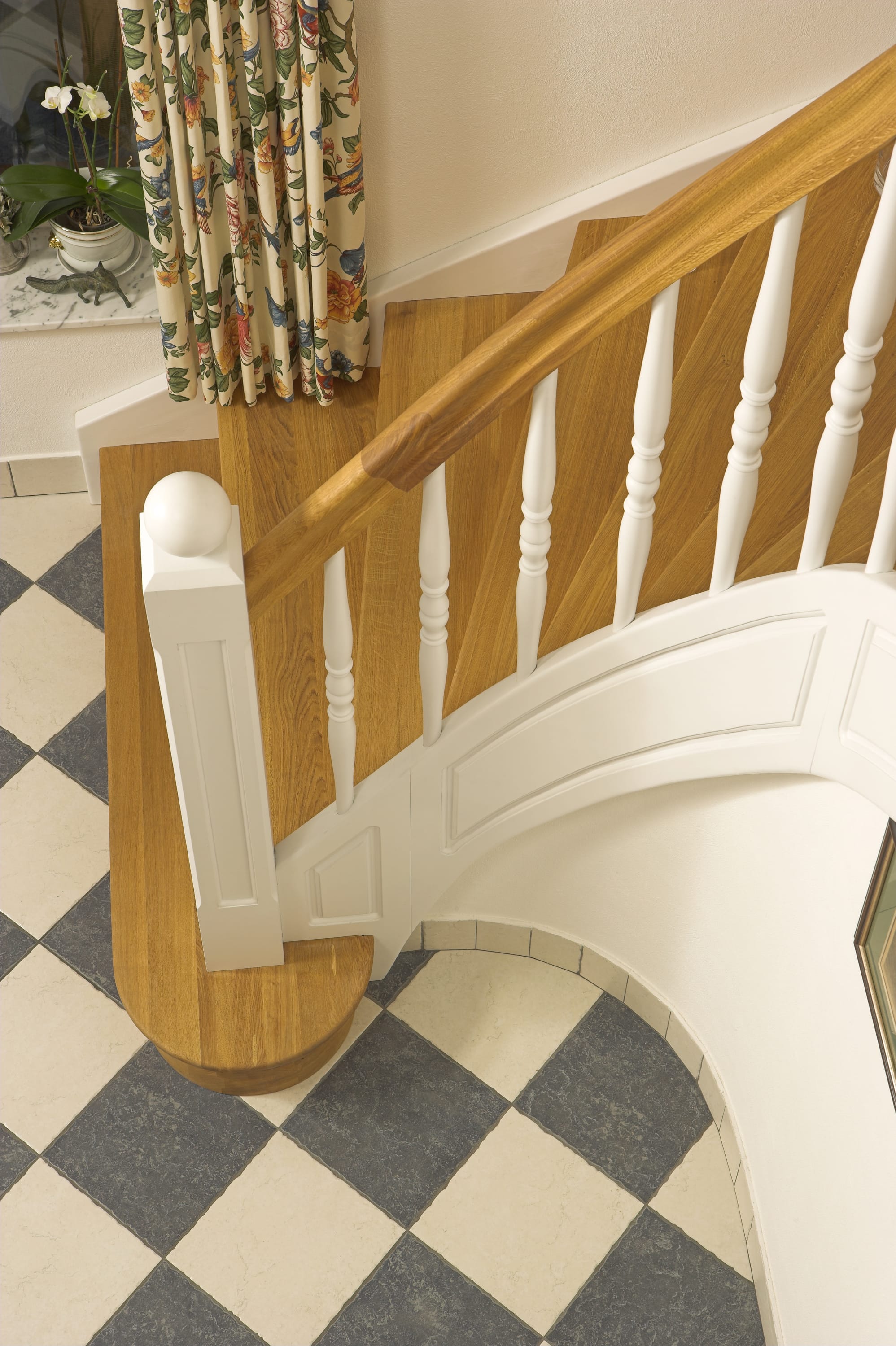 Geschlossene Wangentreppe; Holzart Eiche; Handlauf und Pfosten Holzart Whitewood weiß endlackiert, Handlauf und Wangenkrümmling im Wendel