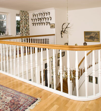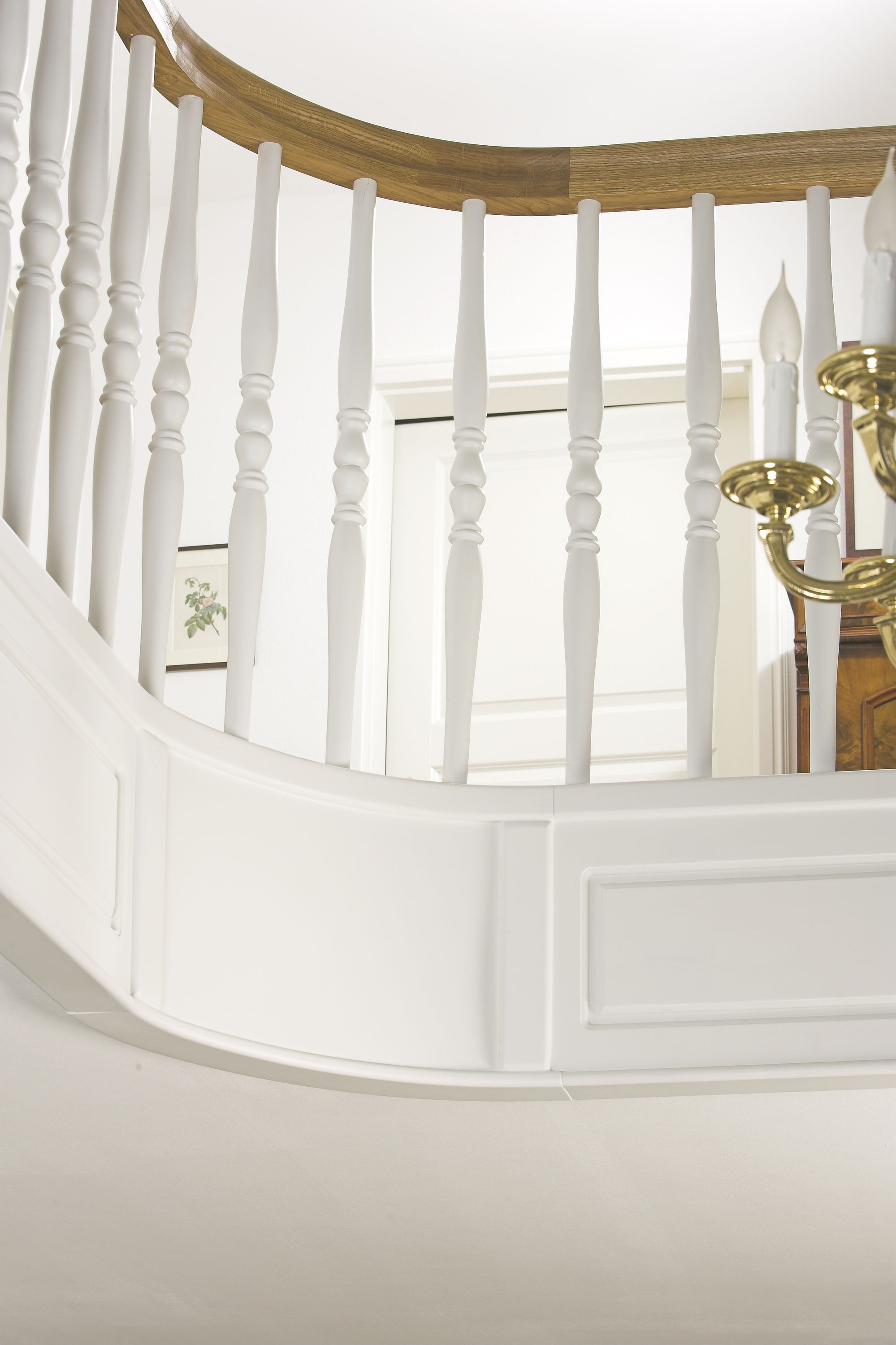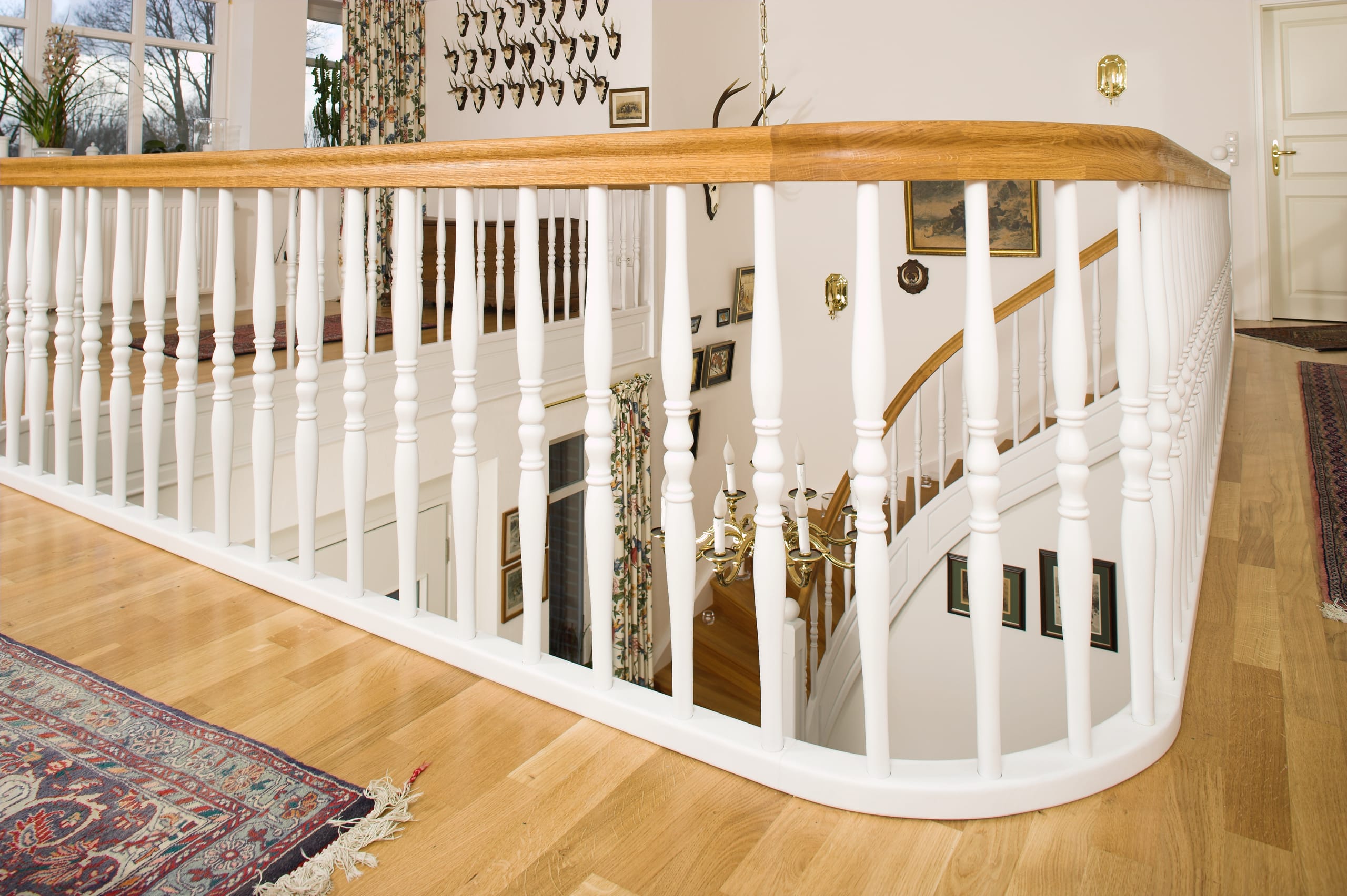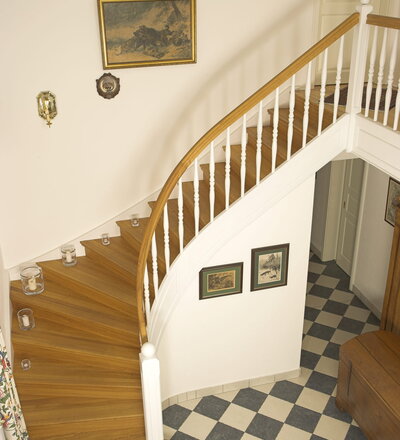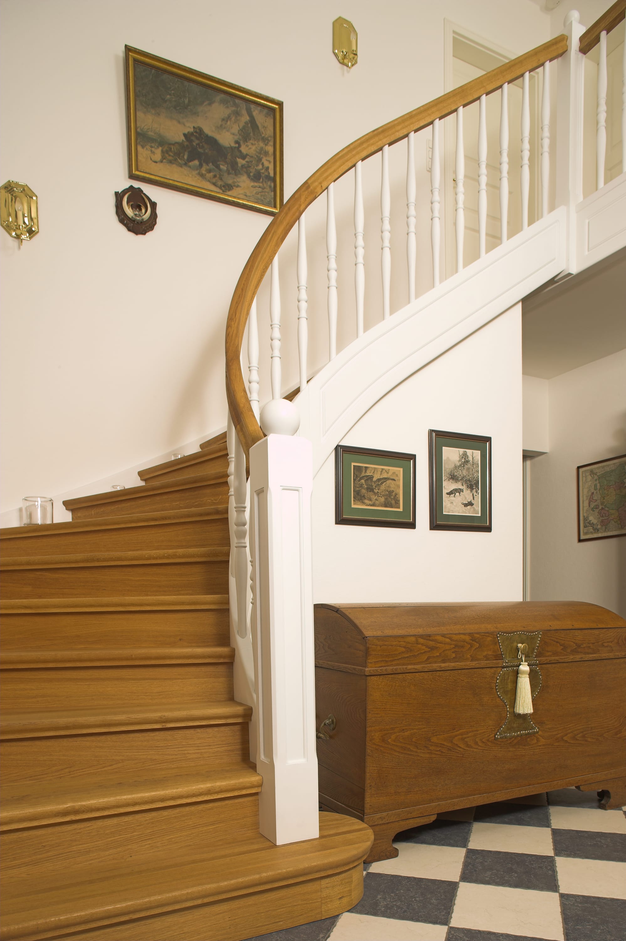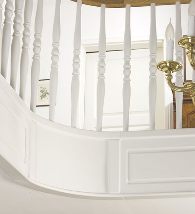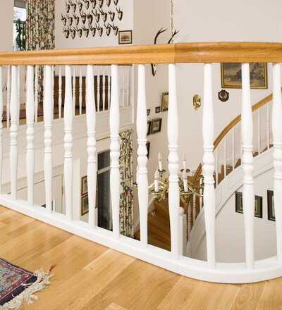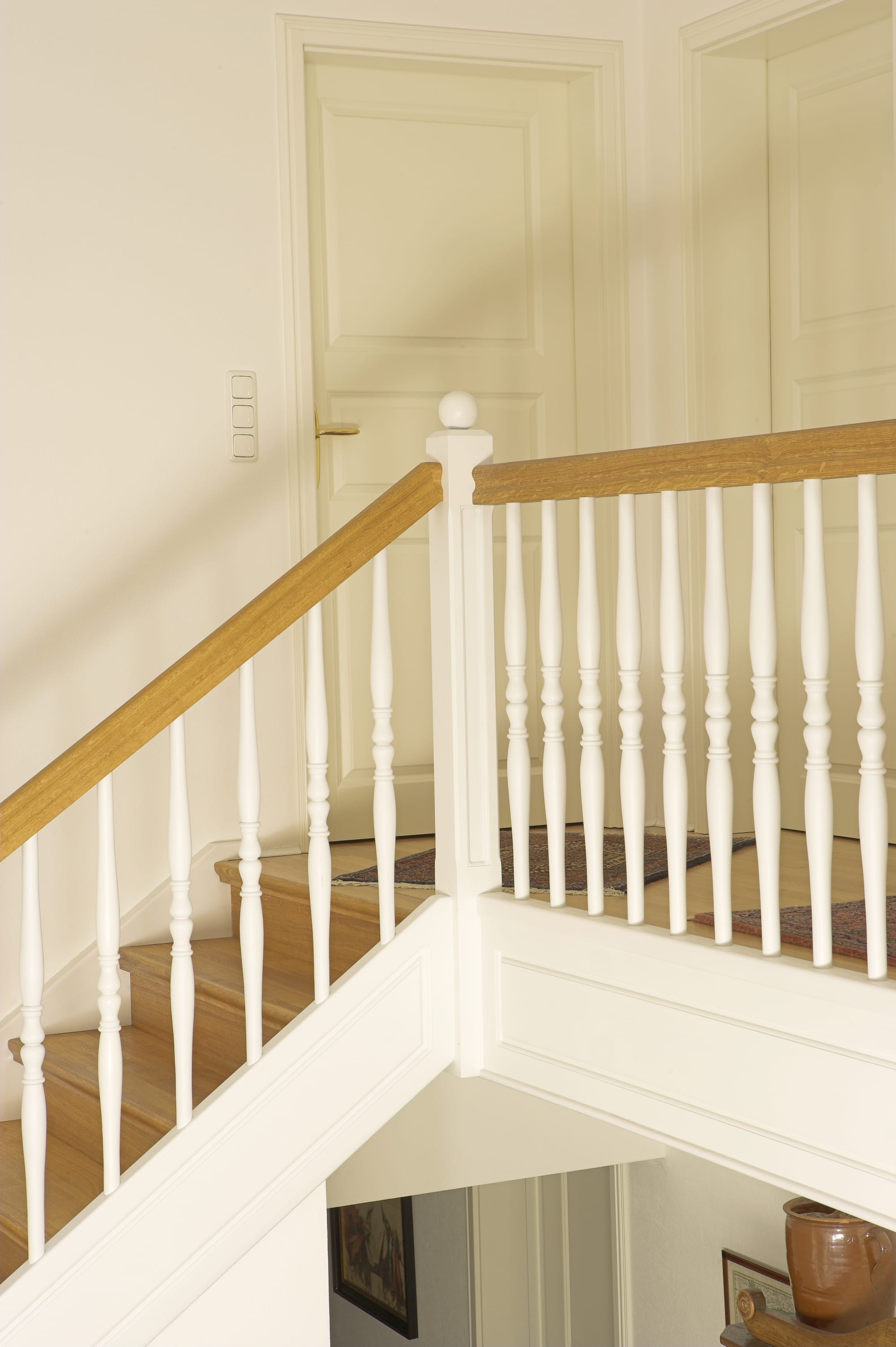 Geschlossene Wangentreppe; Holzart Eiche; Handlauf und Pfosten Holzart Whitewood weiß endlackiert, Handlauf und Wangenkrümmling im Wendel