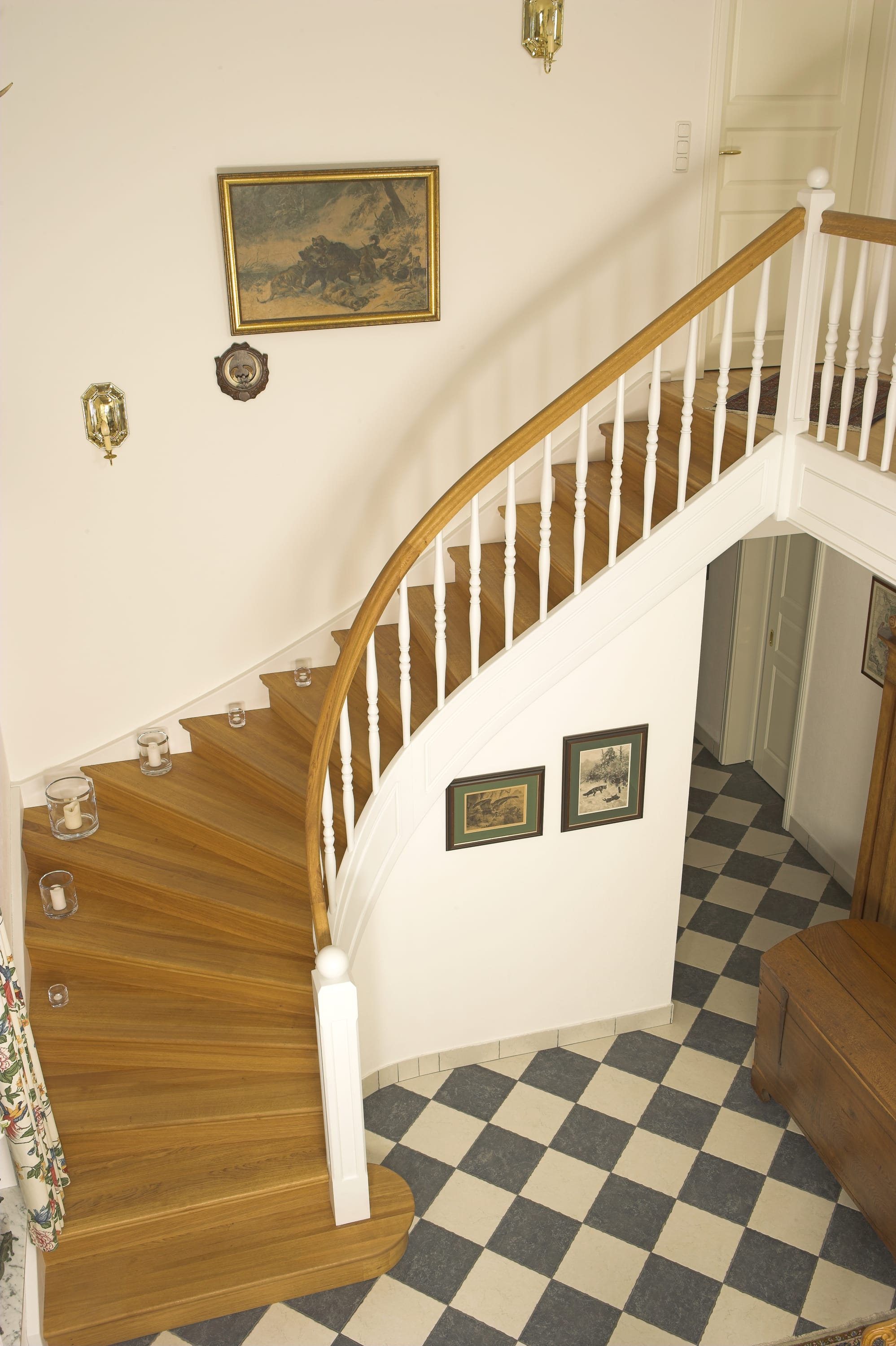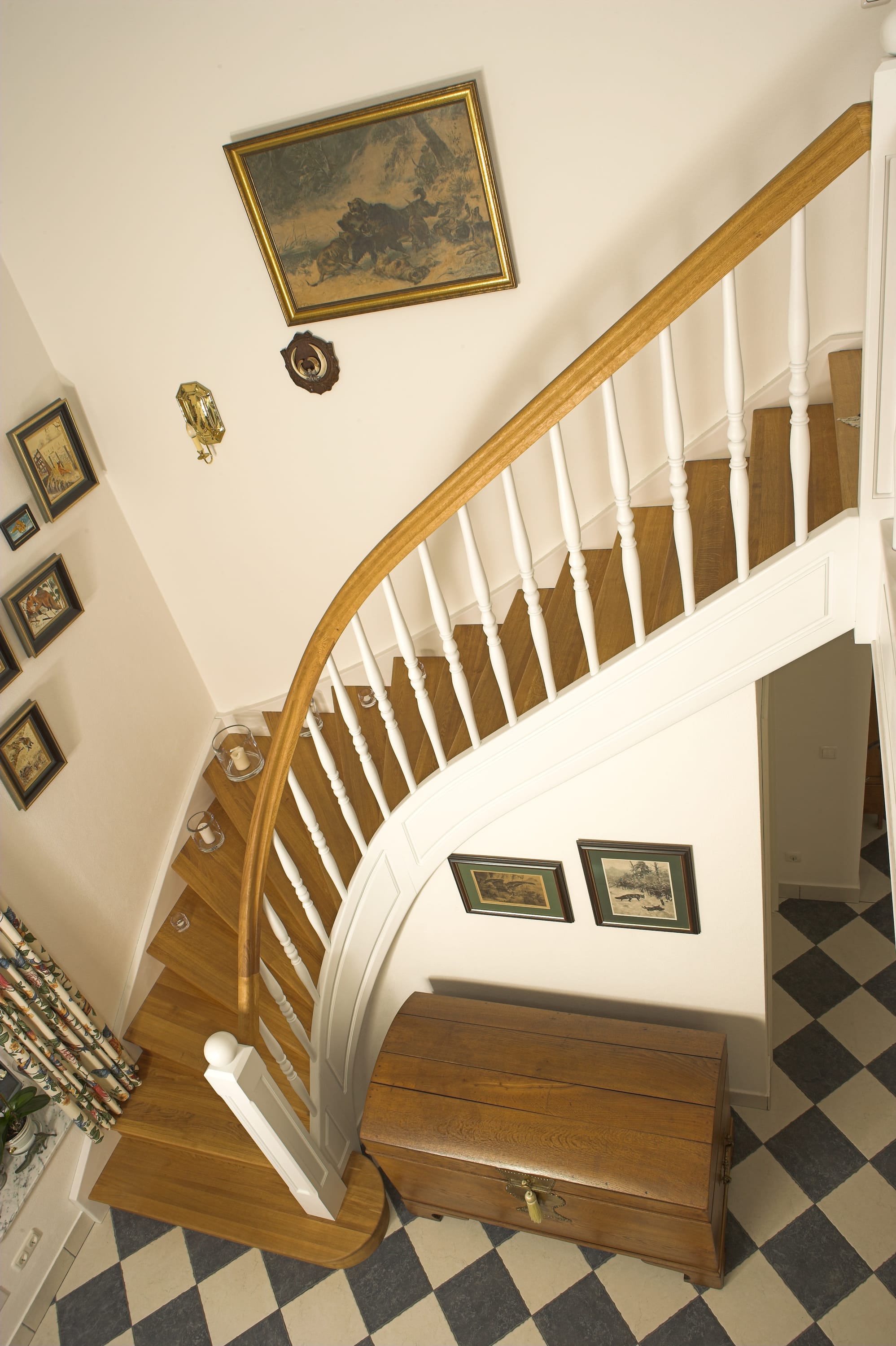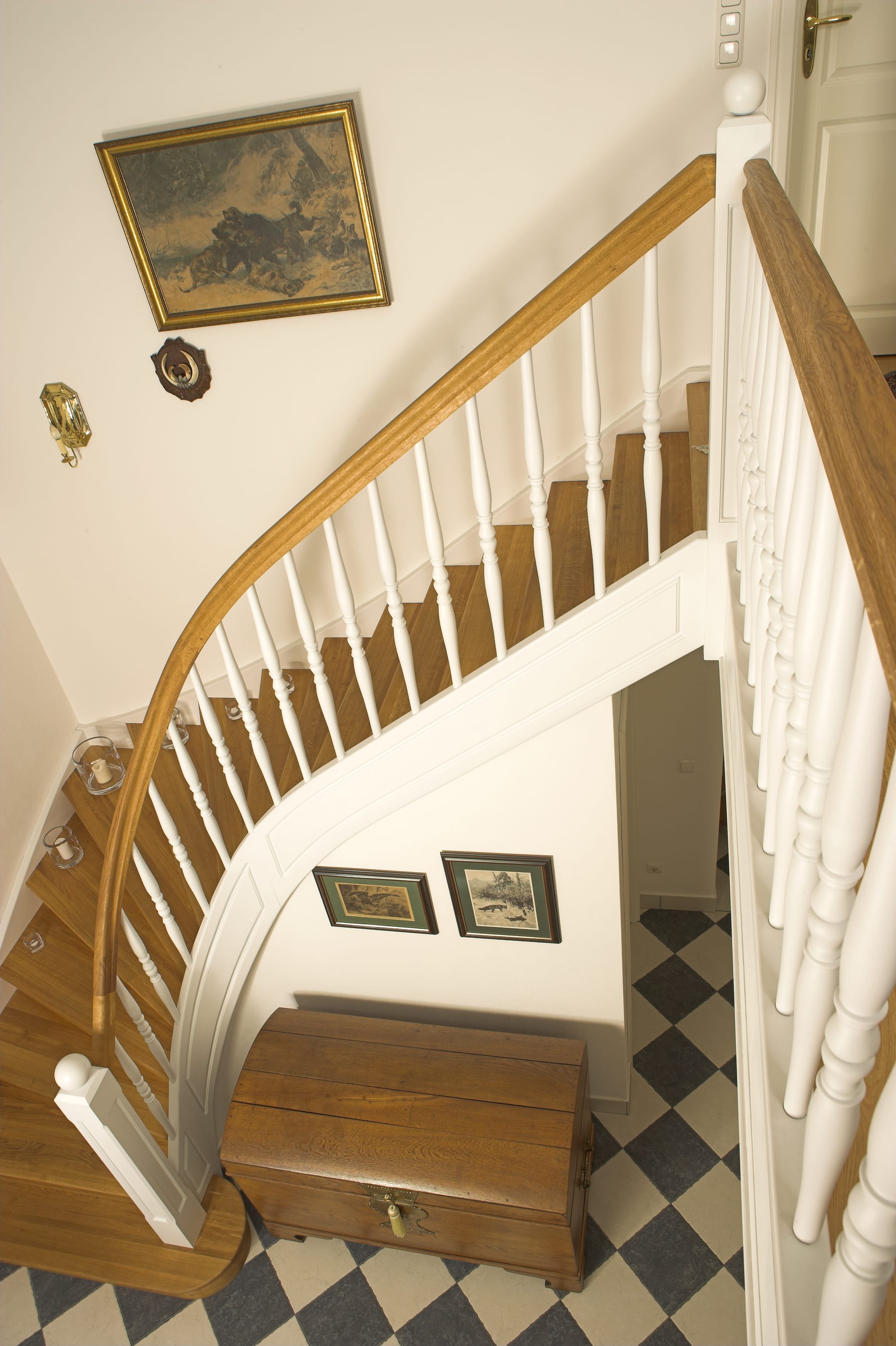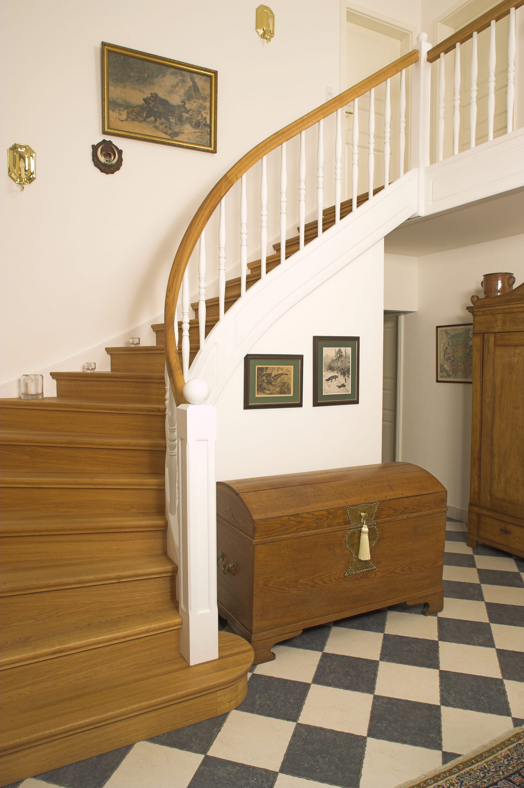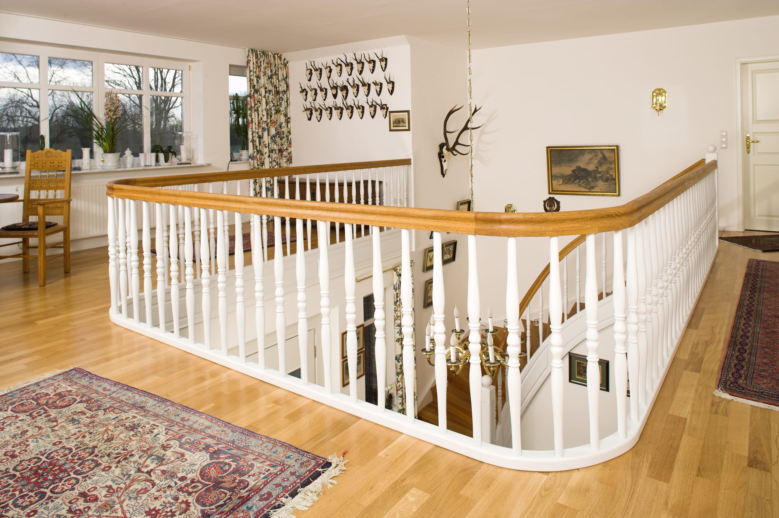 Geschlossene Wangentreppe; Holzart Eiche; Handlauf und Pfosten Holzart Whitewood weiß endlackiert, Handlauf und Wangenkrümmling im Wendel