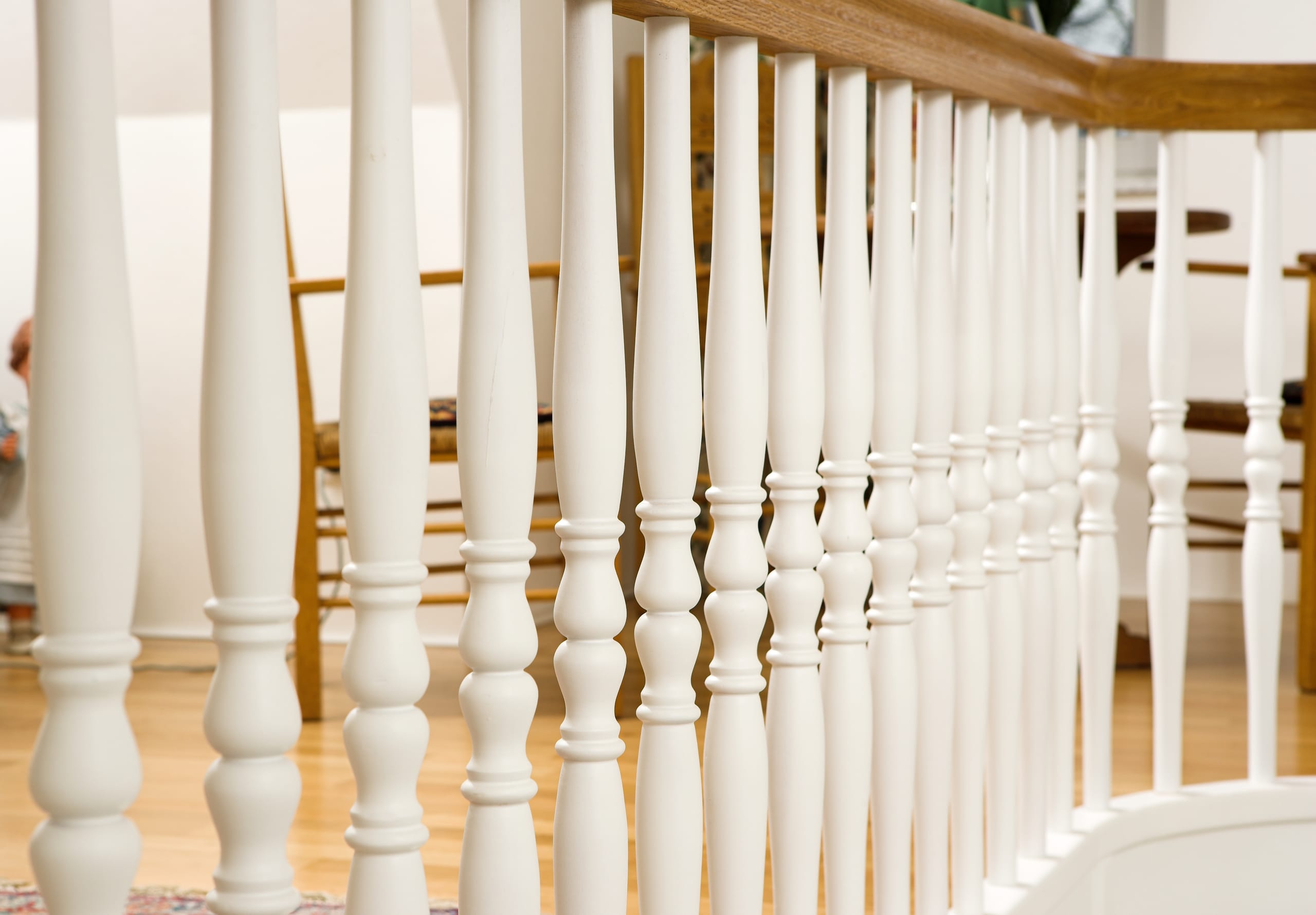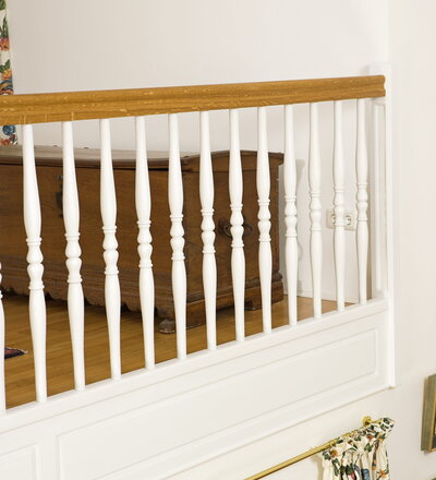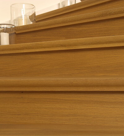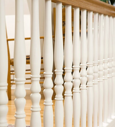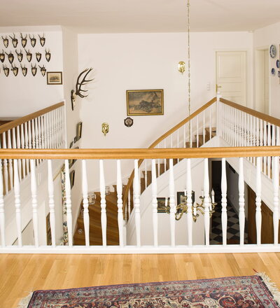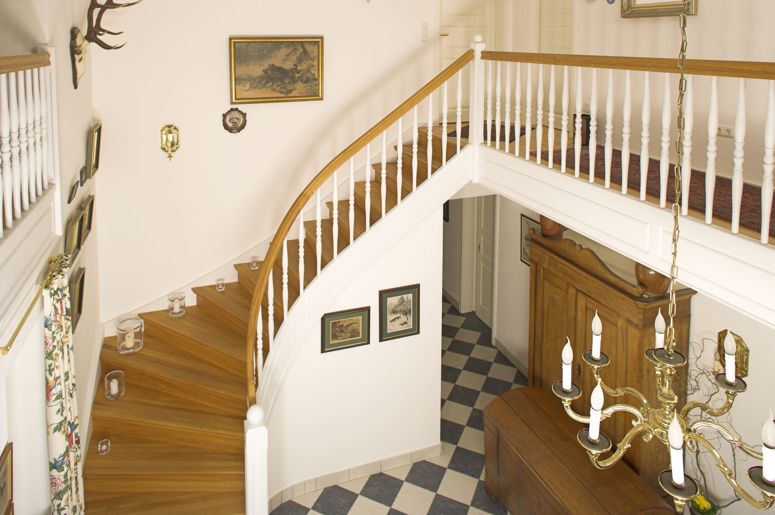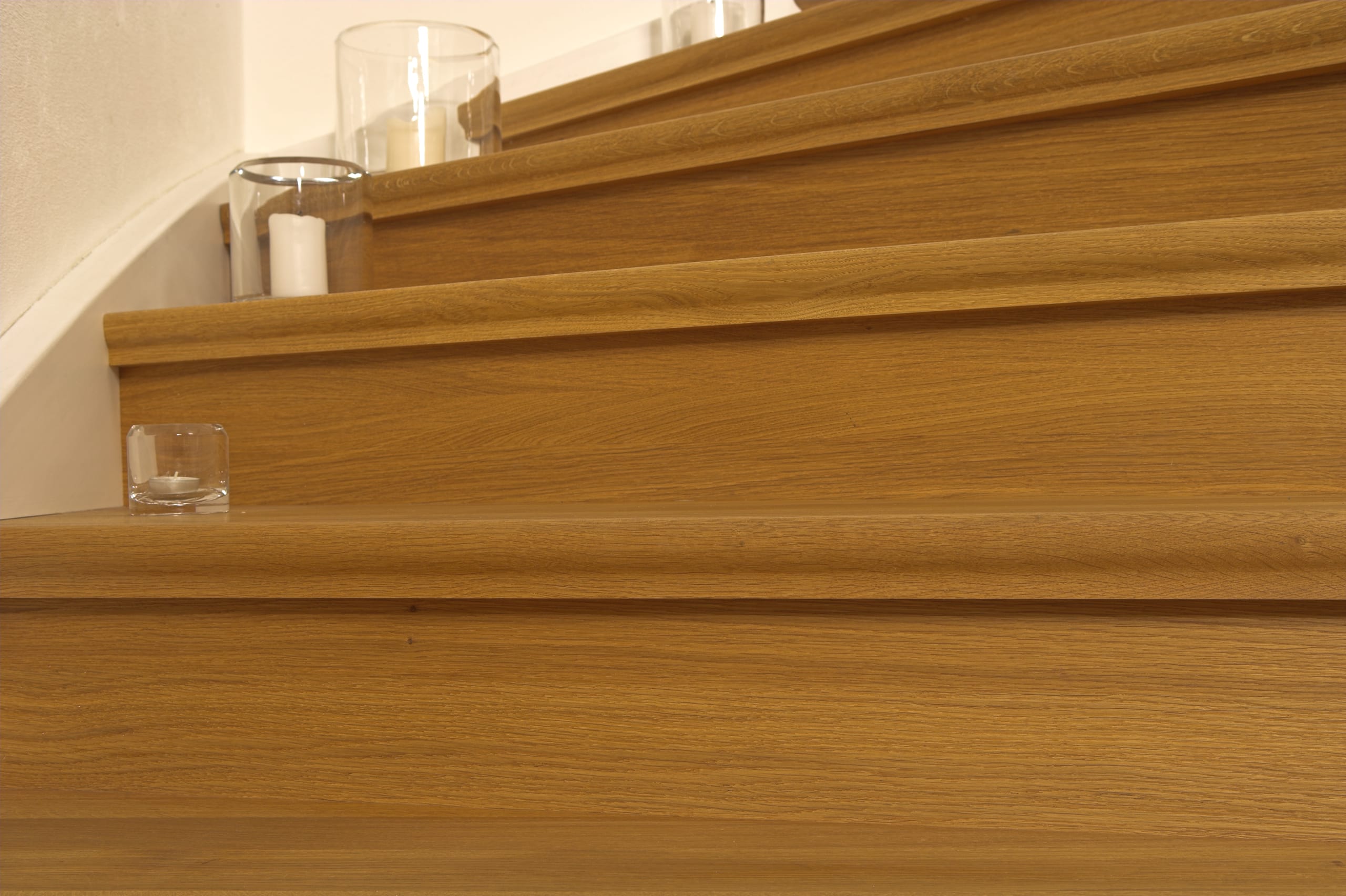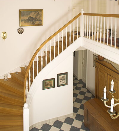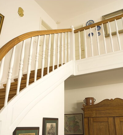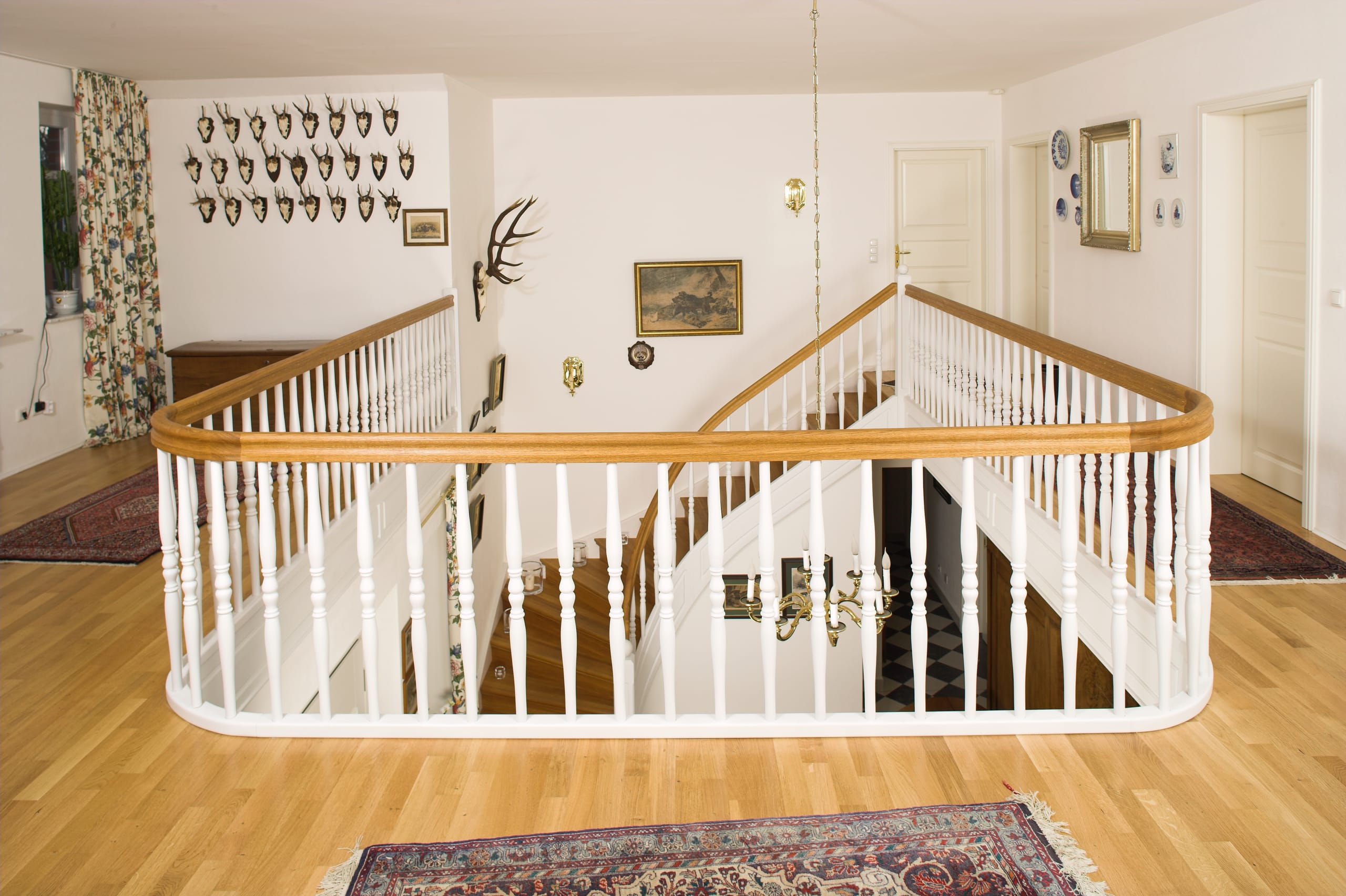 Geschlossene Wangentreppe; Holzart Eiche; Handlauf und Pfosten Holzart Whitewood weiß endlackiert, Handlauf und Wangenkrümmling im Wendel